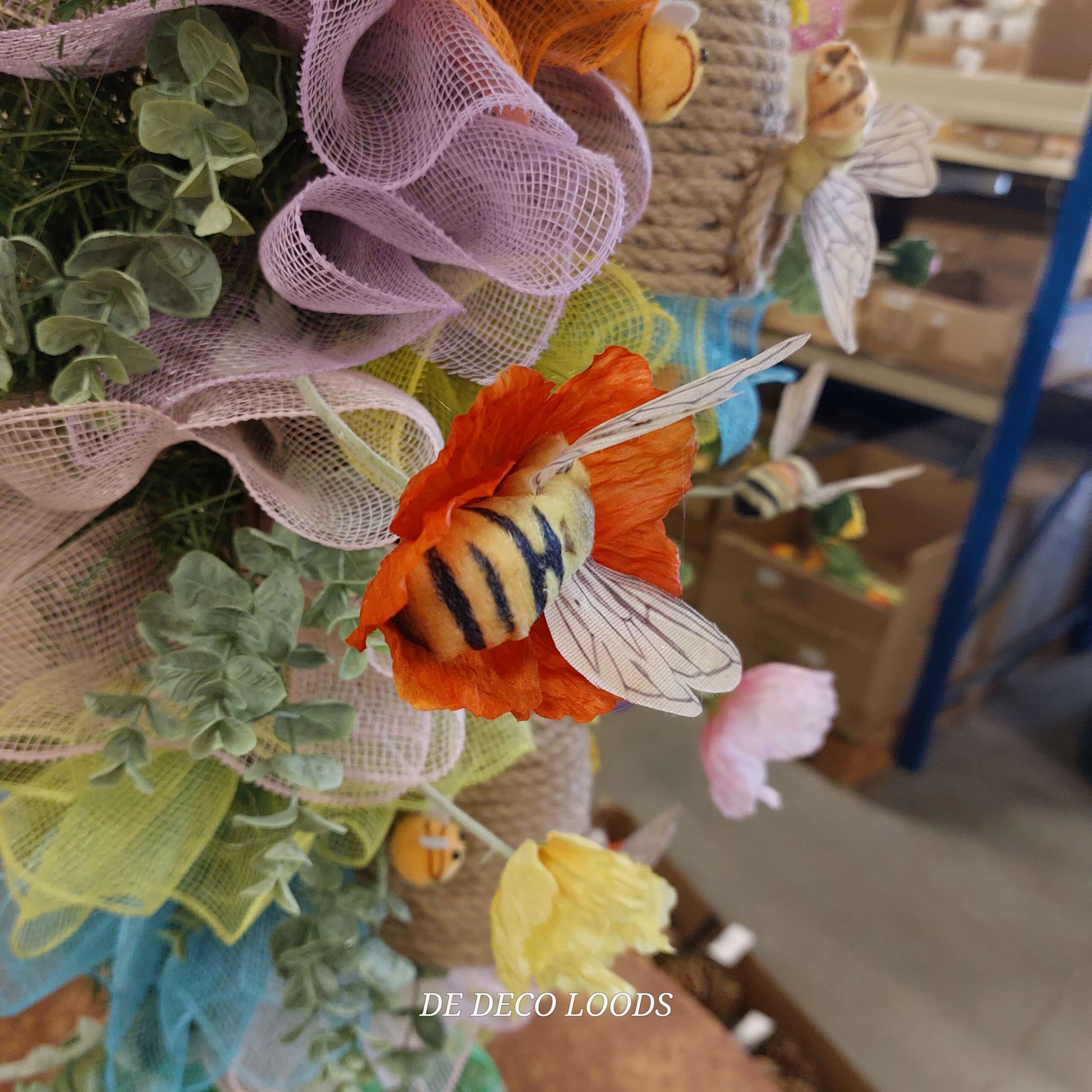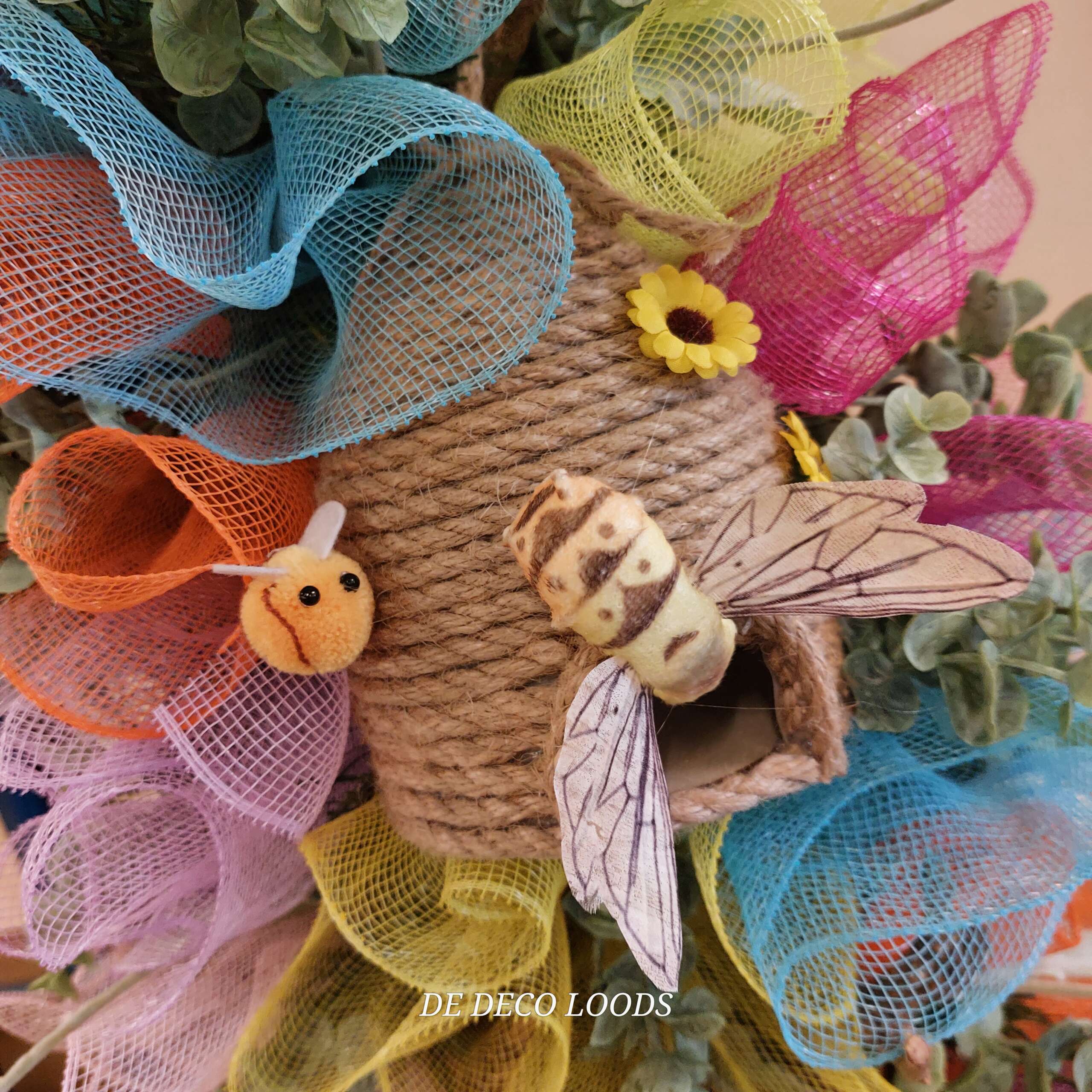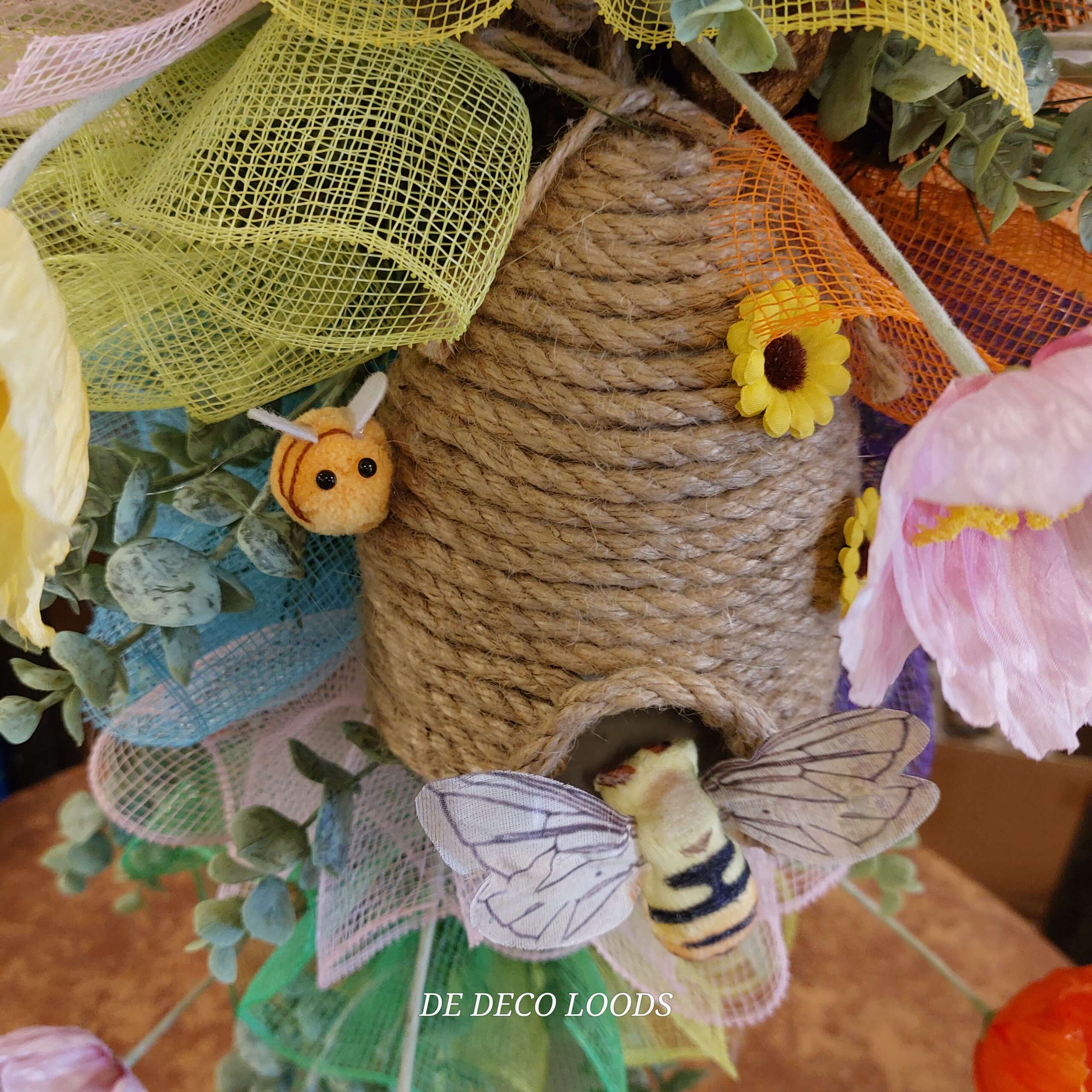 Bee Hive Swag – Kleurrijke bijenkorf decoratie met deco mesh, bloemen en bijtjes