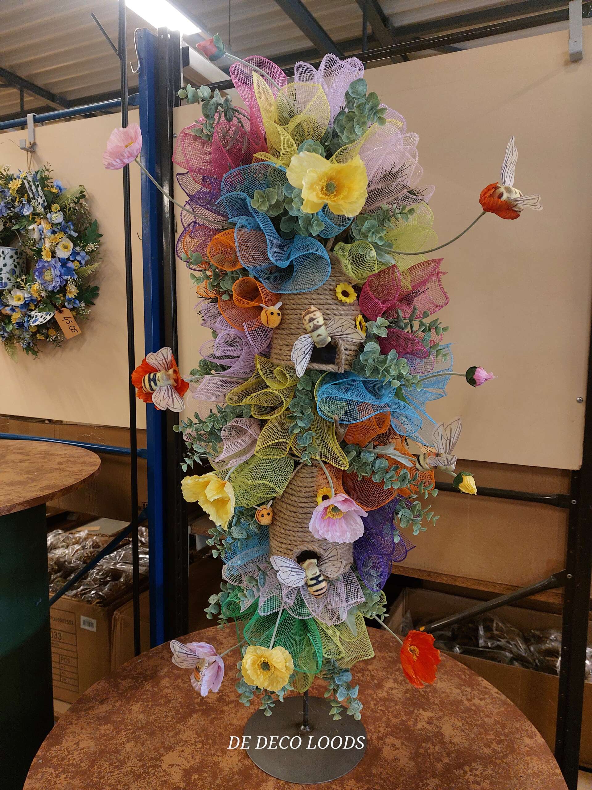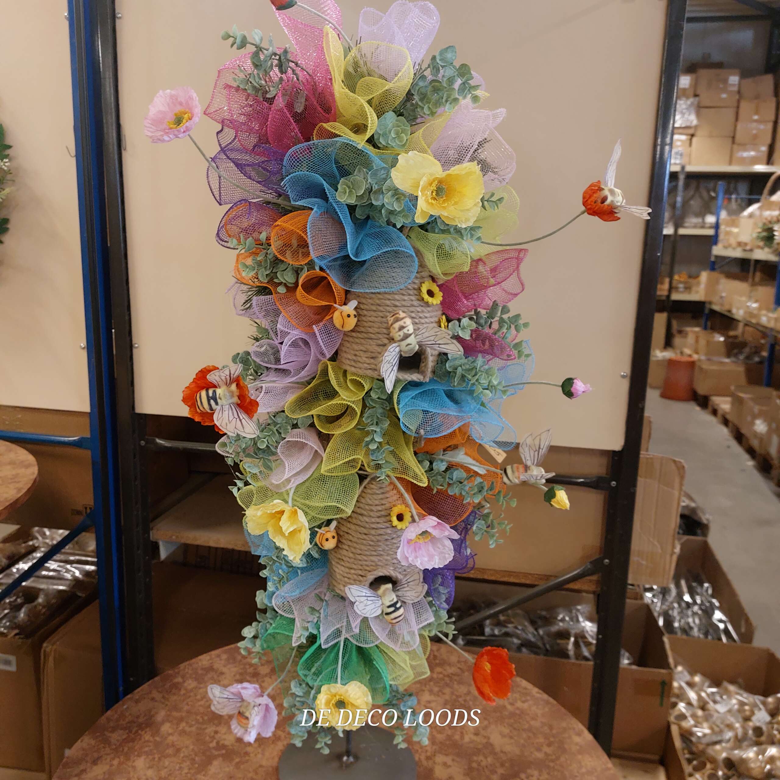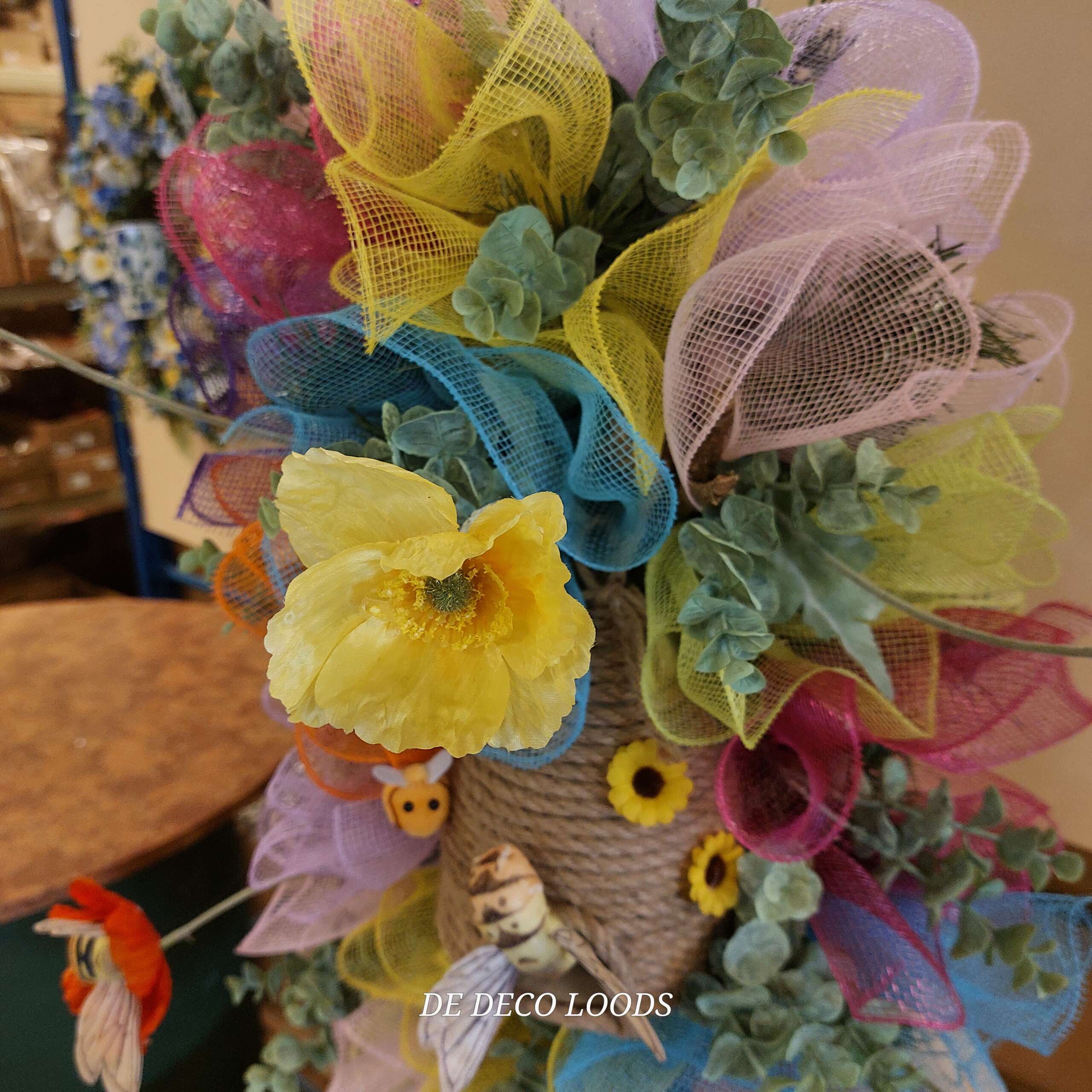 Bee Hive Swag – Kleurrijke bijenkorf decoratie met deco mesh, bloemen en bijtjes