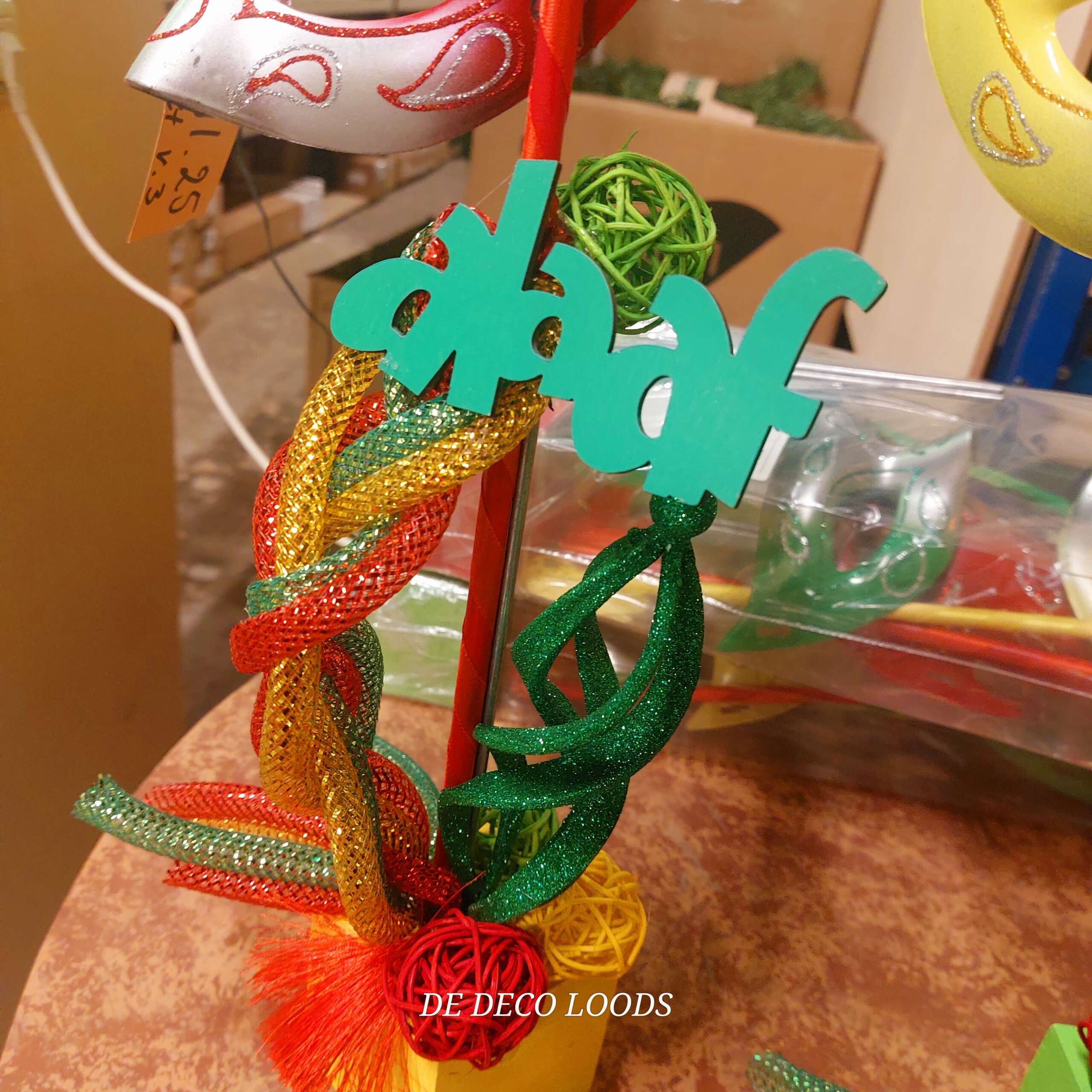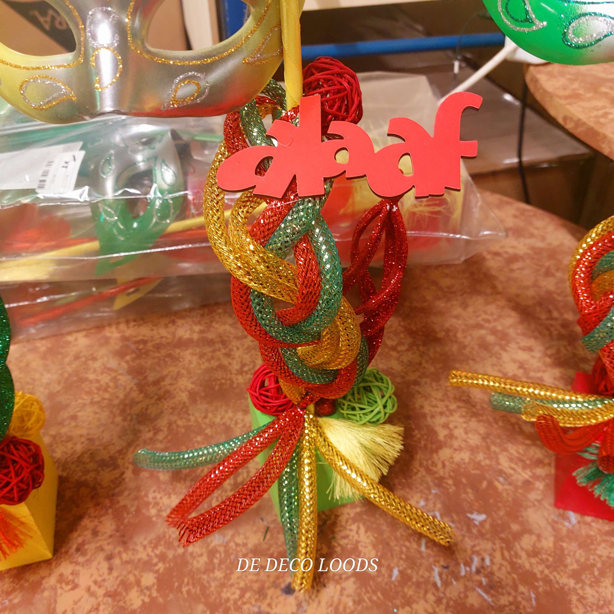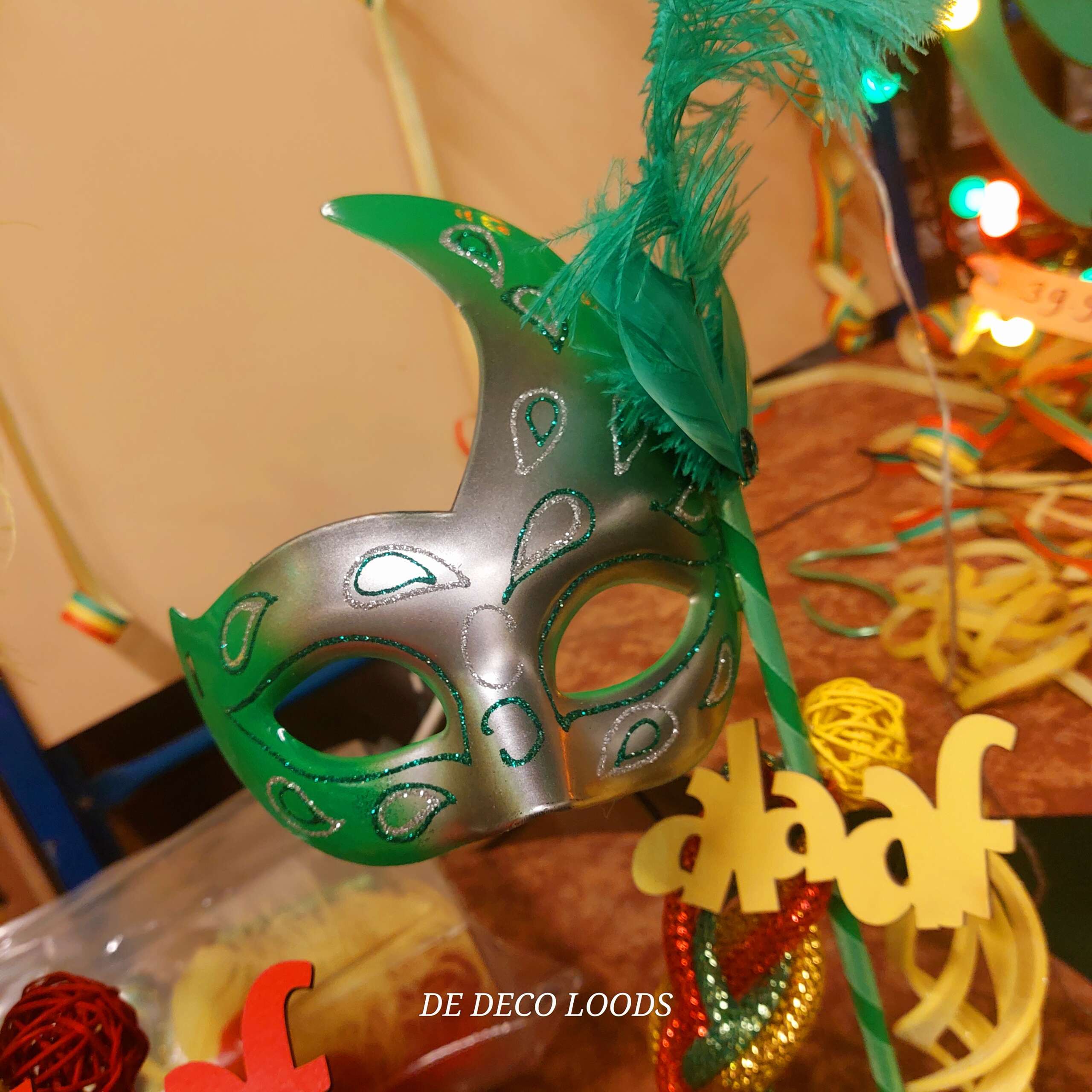 De maskers zijn bevestigd op blokjes, gedecoreerd met gevlochten tubes in bijpassende kleuren, die stevig verankerd zijn in een decoratieve basis. Rondom de maskers vind je kleine rotan balletjes, glitterende deco tubes en swirl ballen die het geheel een extra feestelijke uitstraling geven. De subtiele glitters zorgen ervoor dat het licht prachtig wordt gevangen, waardoor de decoratie sprankelt op elke tafelsetting. De 3 woordjes met alaaf maken dan de finisching touch aan het geheel.