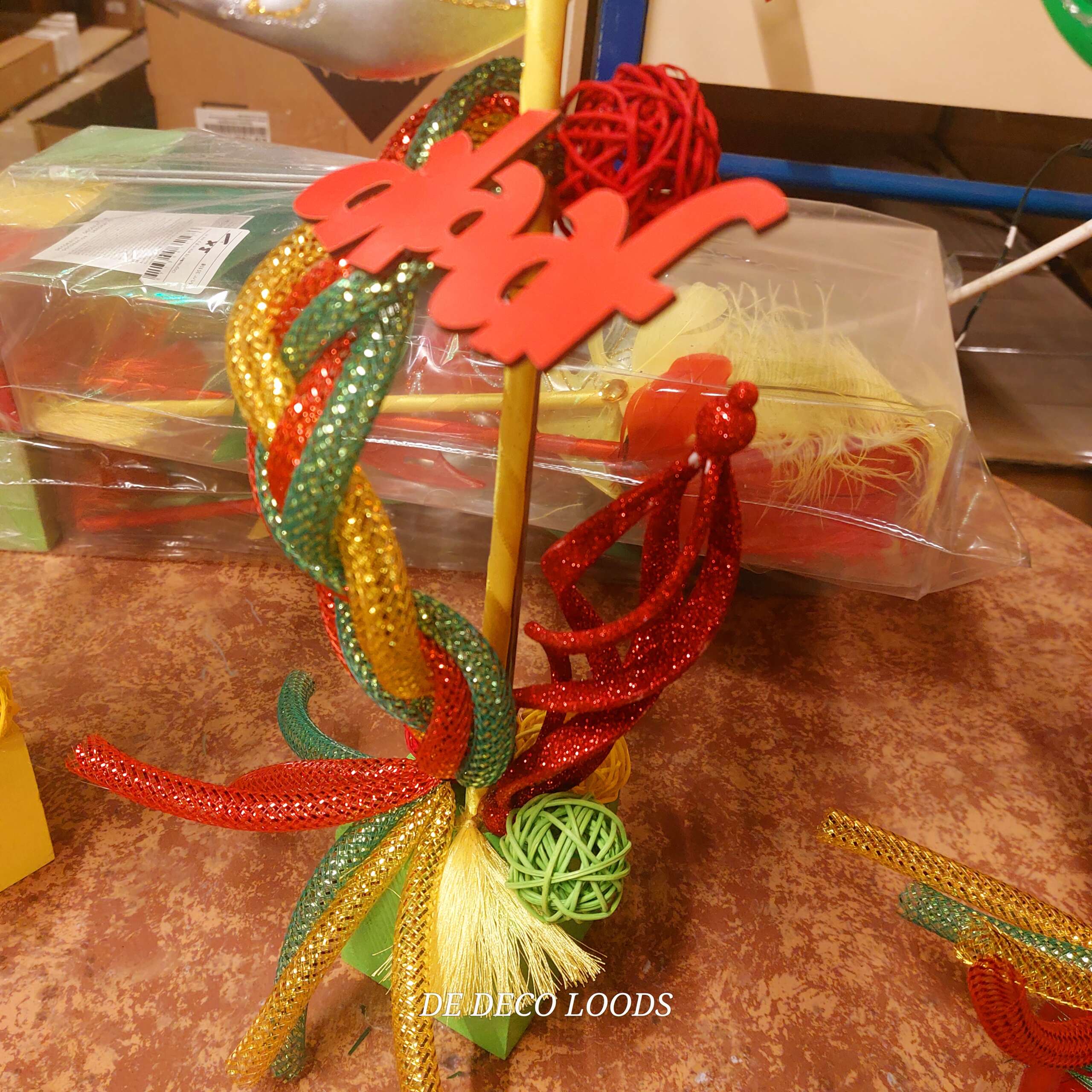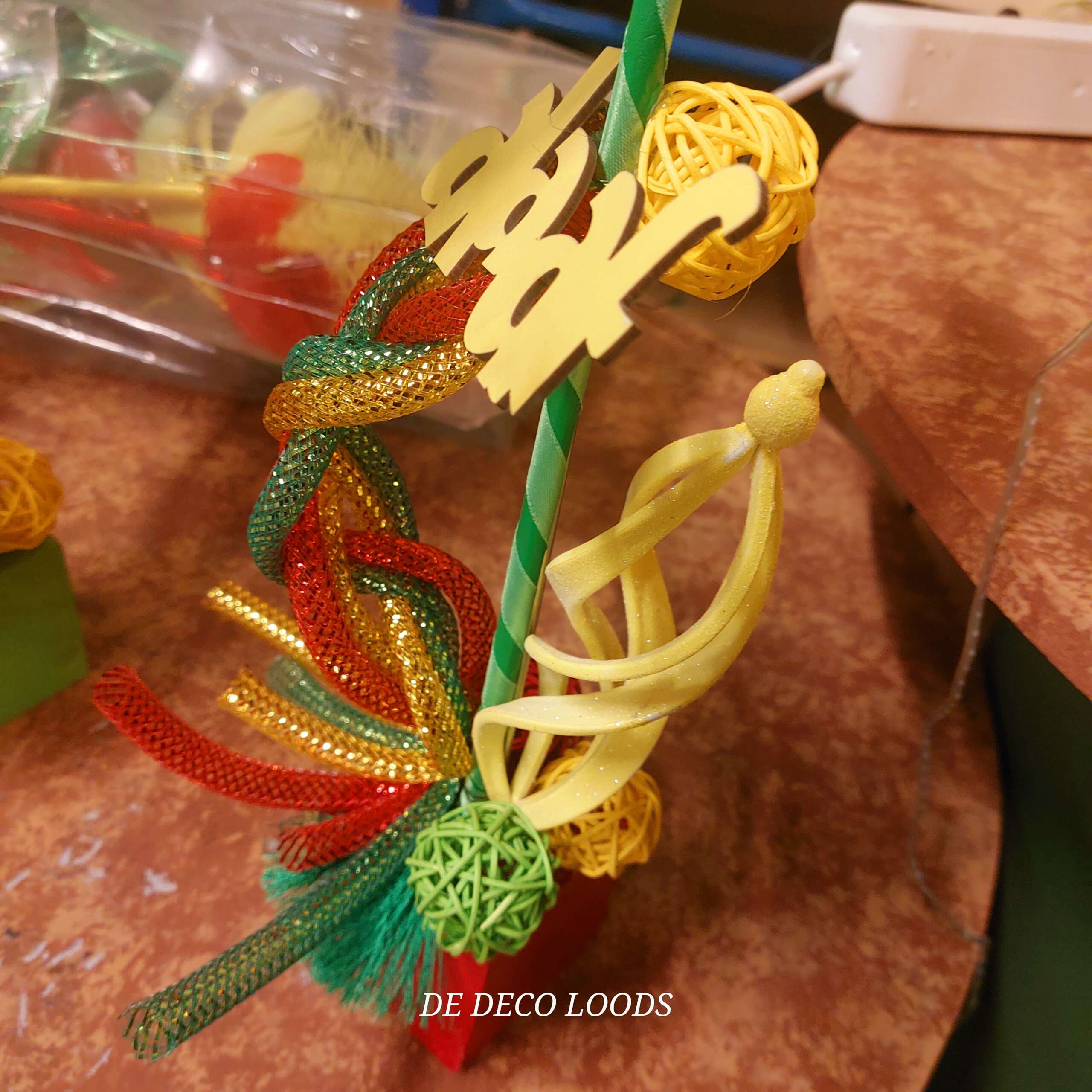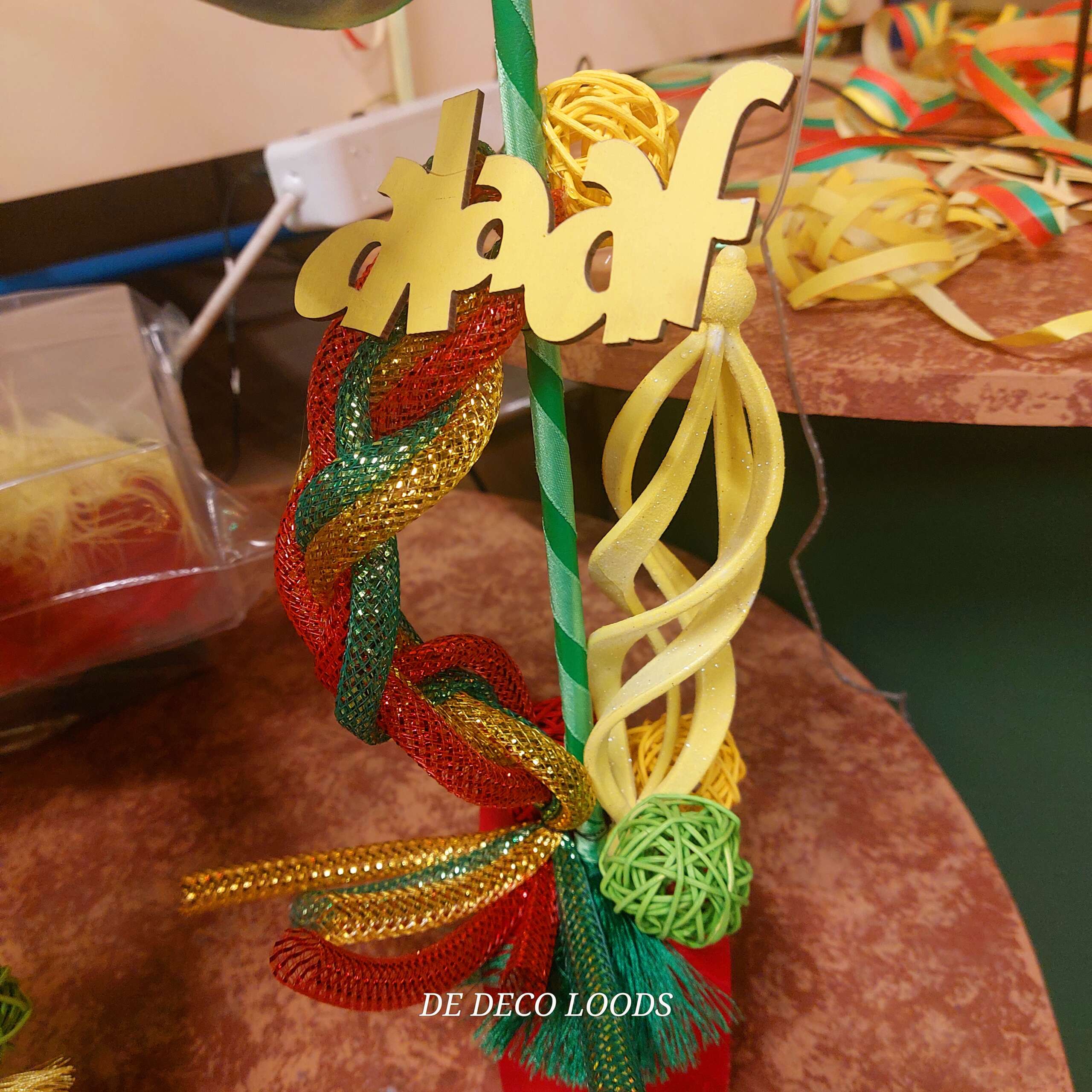 De maskers zijn bevestigd op blokjes, gedecoreerd met gevlochten tubes in bijpassende kleuren, die stevig verankerd zijn in een decoratieve basis. Rondom de maskers vind je kleine rotan balletjes, glitterende deco tubes en swirl ballen die het geheel een extra feestelijke uitstraling geven. De subtiele glitters zorgen ervoor dat het licht prachtig wordt gevangen, waardoor de decoratie sprankelt op elke tafelsetting. De 3 woordjes met alaaf maken dan de finisching touch aan het geheel.