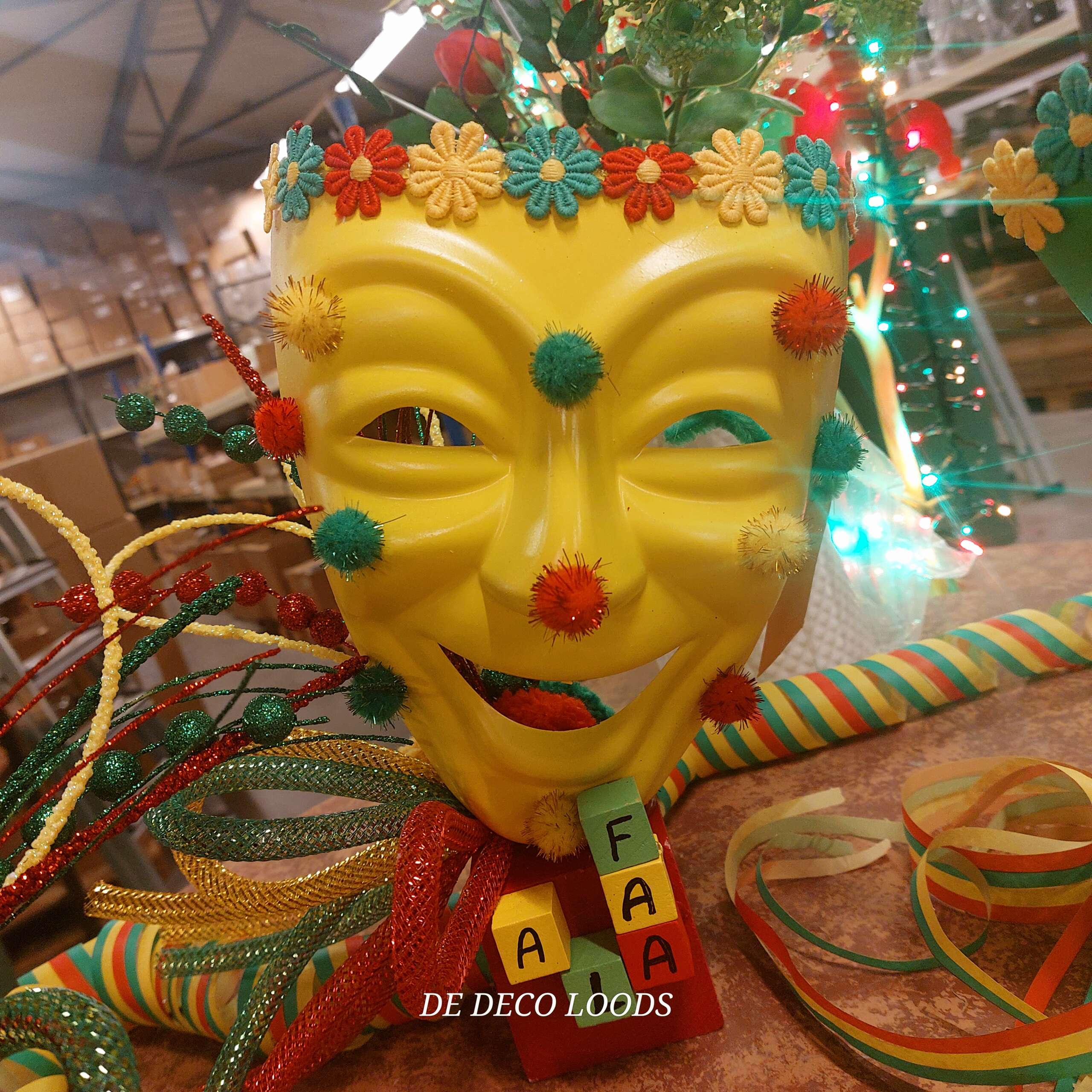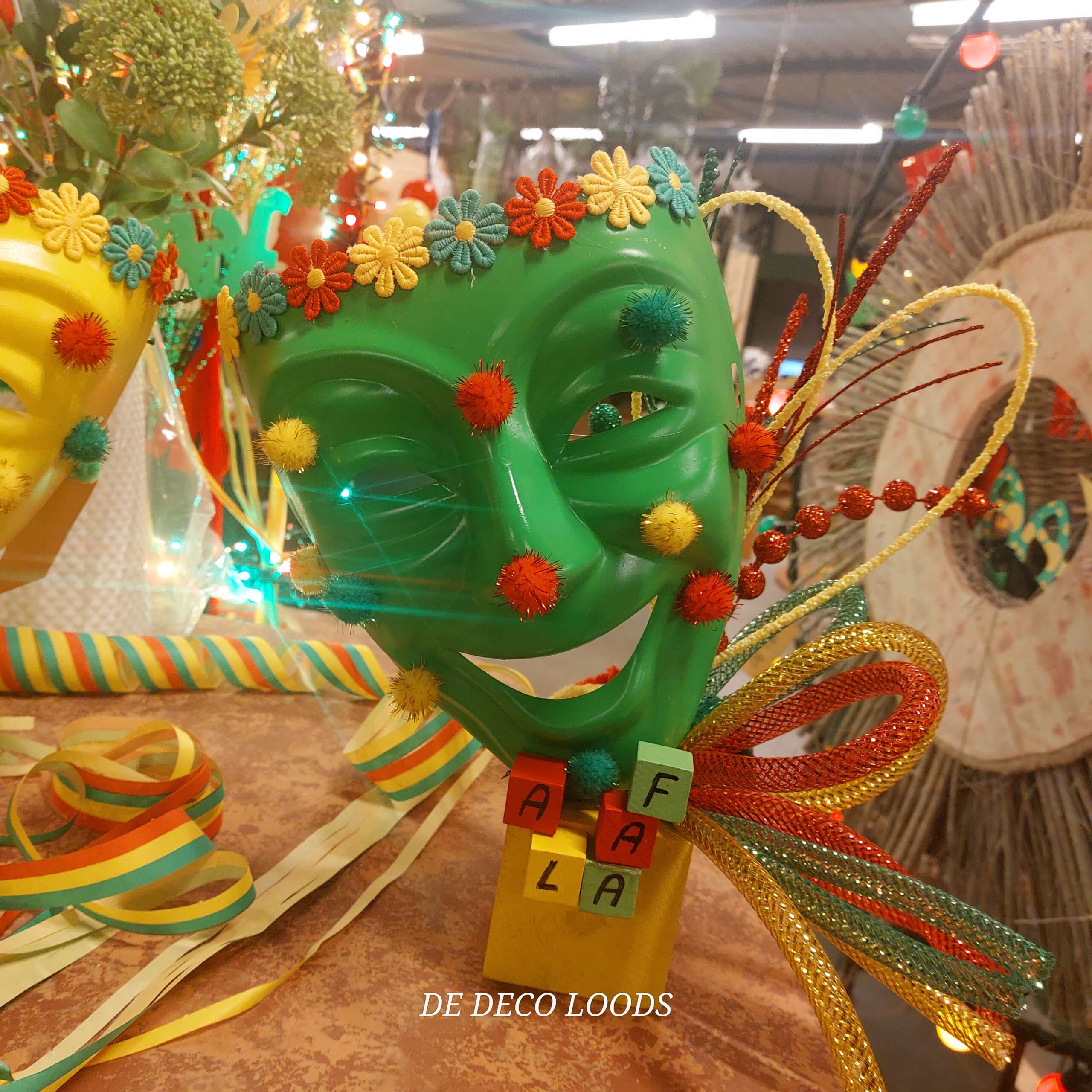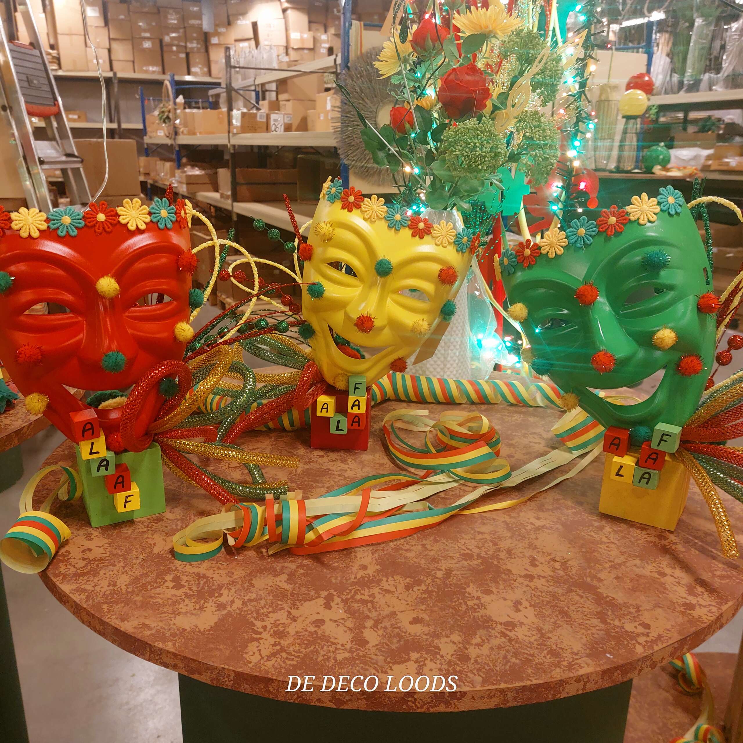 Carnavals koorts. Laat de carnavalskoorts losbarsten met deze unieke Carnavals Koorts Decoratie! Deze kleurrijke tafeldecoratie bestaat uit drie feestelijke maskers in de klassieke carnavalskleuren rood geel en groen, rijkelijk versierd met pomponnetjes, bloemenband, tubes en takken. Elk masker straalt pure feestvreugde uit — alsof ze zélf carnaval vieren!