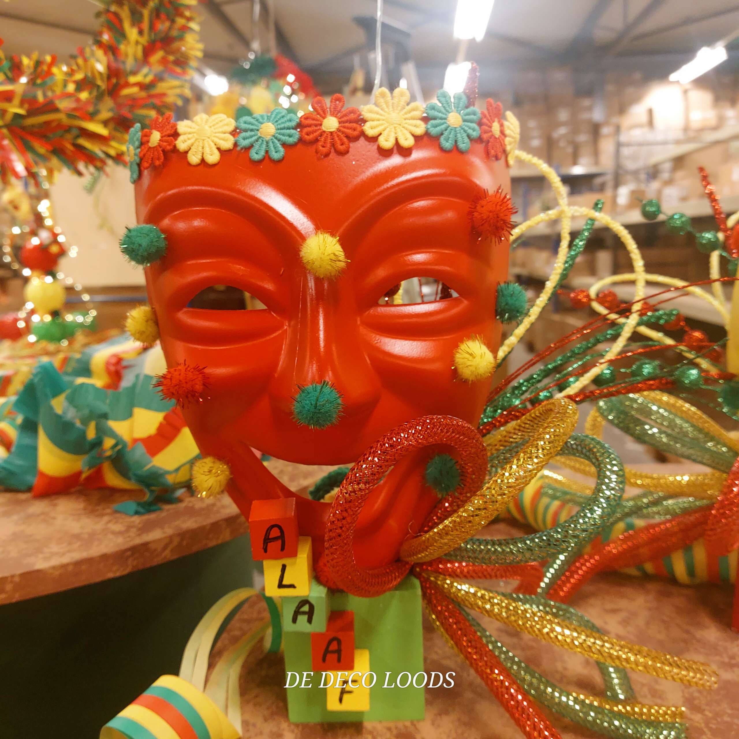 De maskers zijn stevig bevestigd op blokjes met de letters “ALAAF”, speels gerangschikt voor een extra vrolijk accent. De pomponnetjes op het gezicht geven een grappige “uitslag”, alsof de maskers zó besmet zijn met carnavalskoorts dat ze niet meer stil kunnen zitten. Een knipoog naar het feestgedruis die gegarandeerd een glimlach oproept.