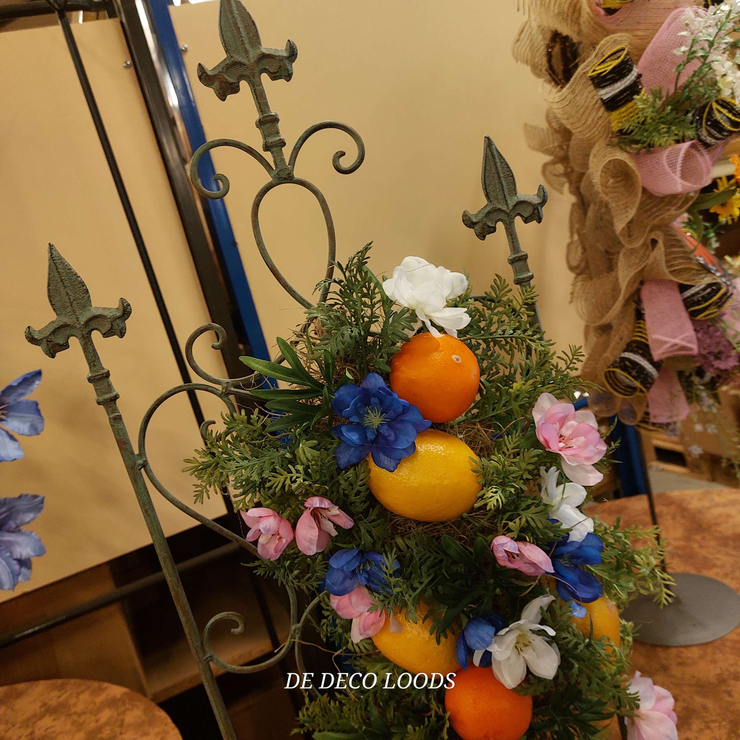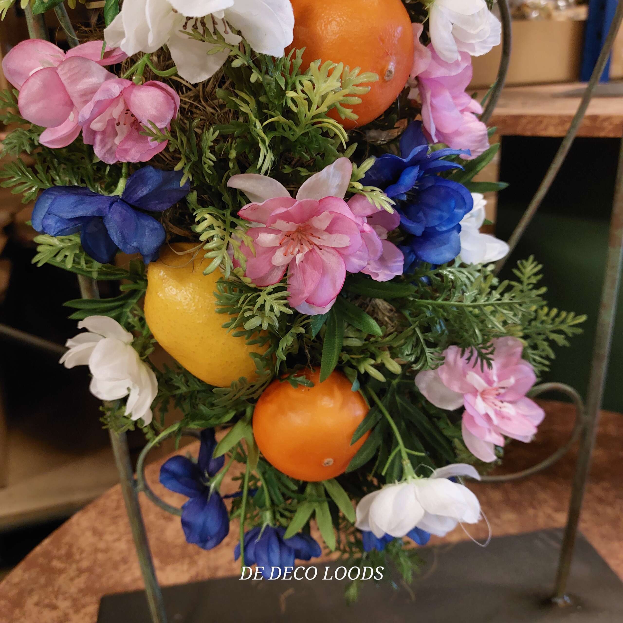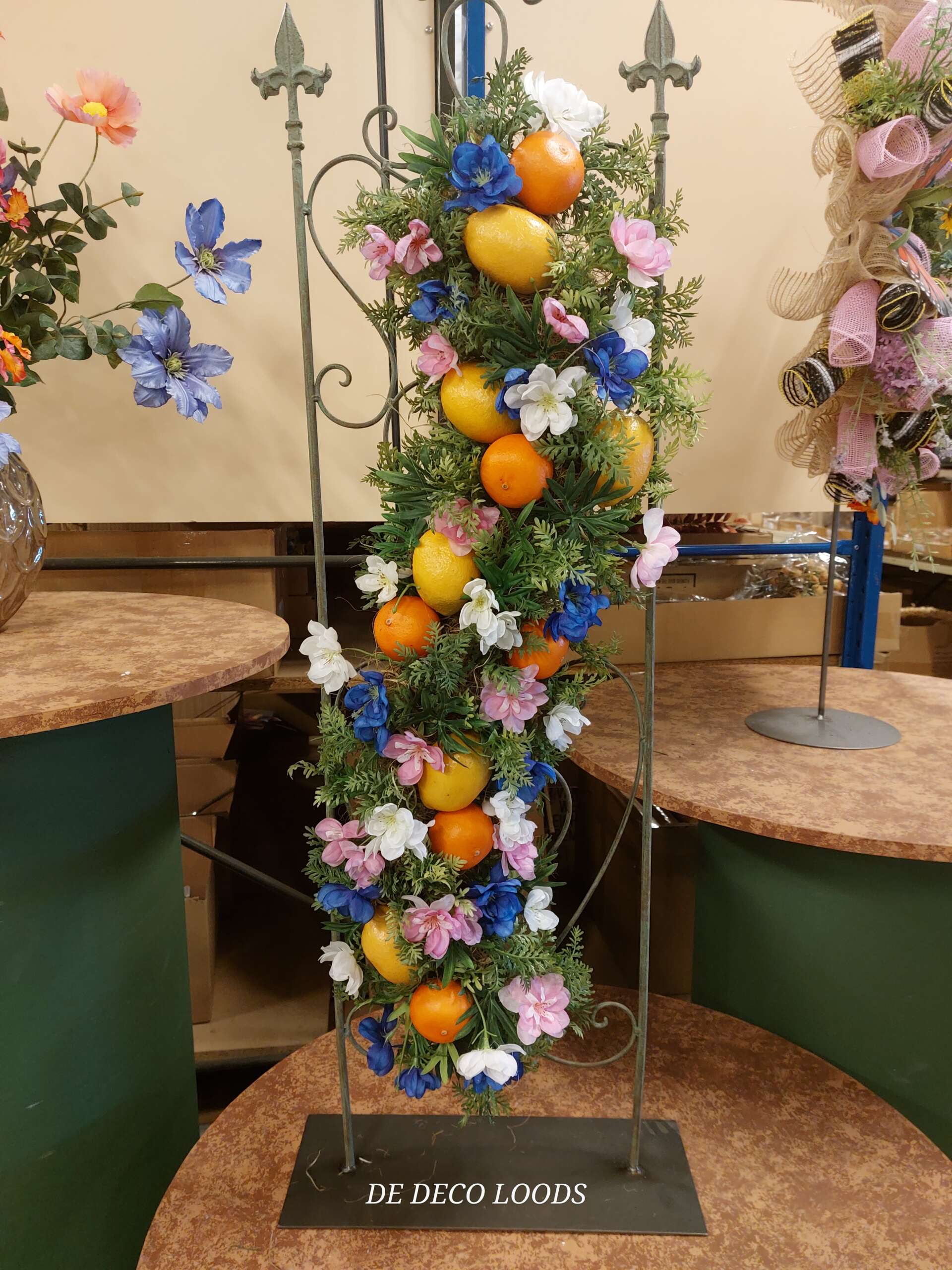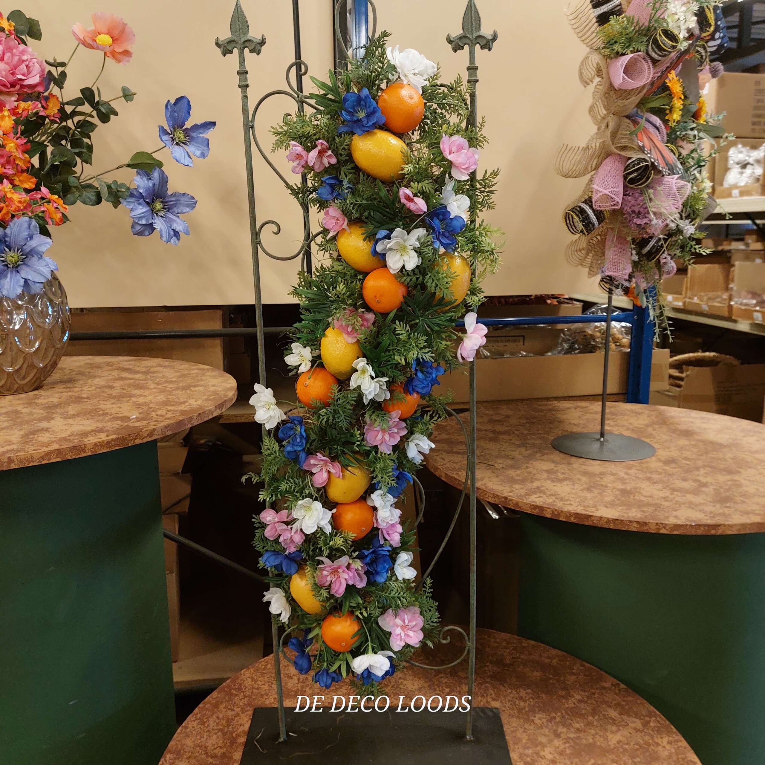 Breng een unieke en verfijnde sfeer in huis of in uw winkelruimte met deze indrukwekkende guirlande met fruit, stijlvol gepresenteerd op een elegant metalen hekwerk met karakteristieke fleur-de-lis hekpunten.
