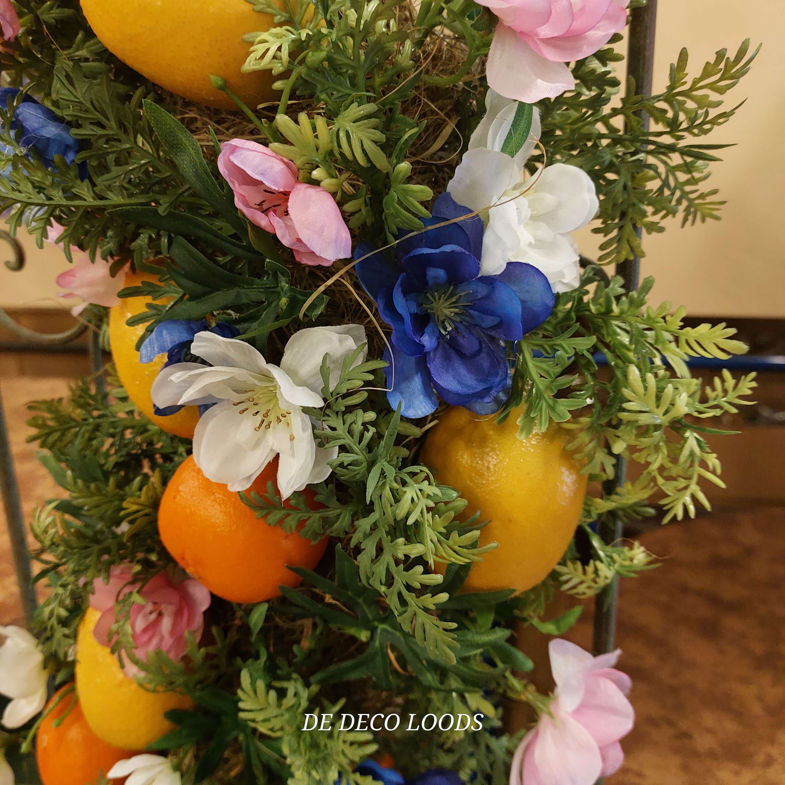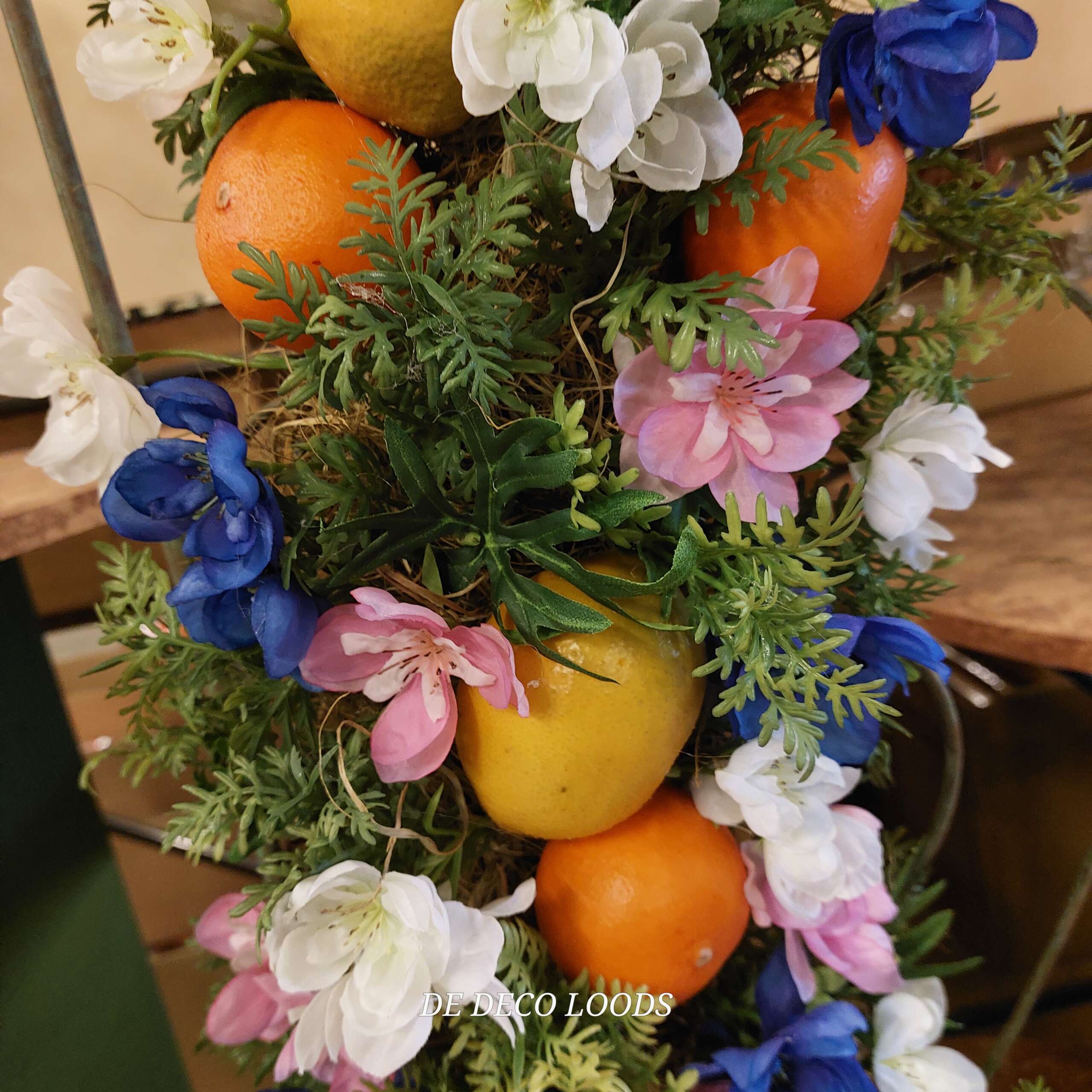 De guirlande is rijkelijk bewerkt met zorgvuldig geselecteerde citroenen en mandarijnen, die zorgen voor een levendig kleurenspel en een zomerse, mediterrane uitstraling.