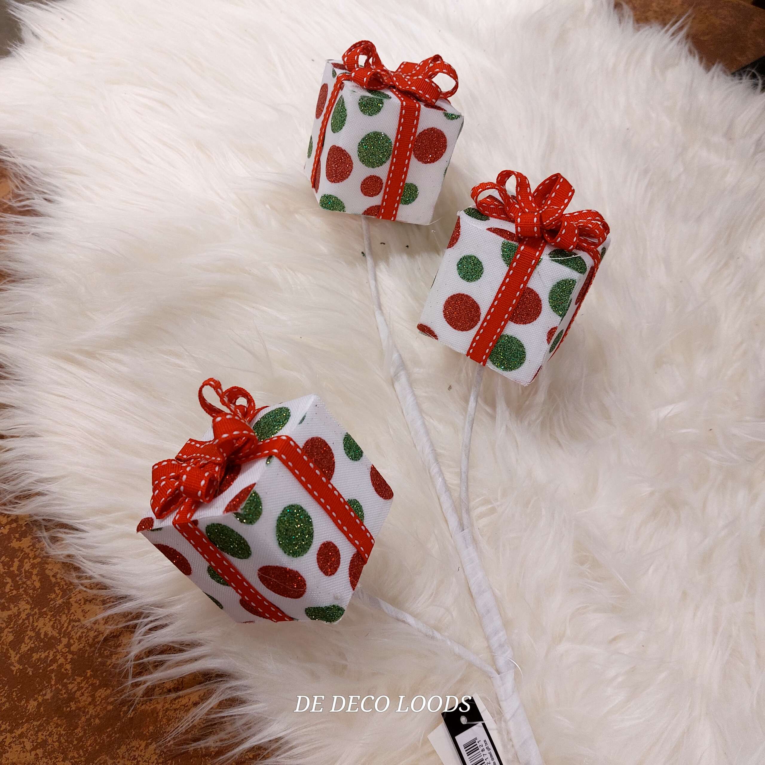 Kadootjes tak, is een tak met drie kadootjes met rood en groene stippen.
