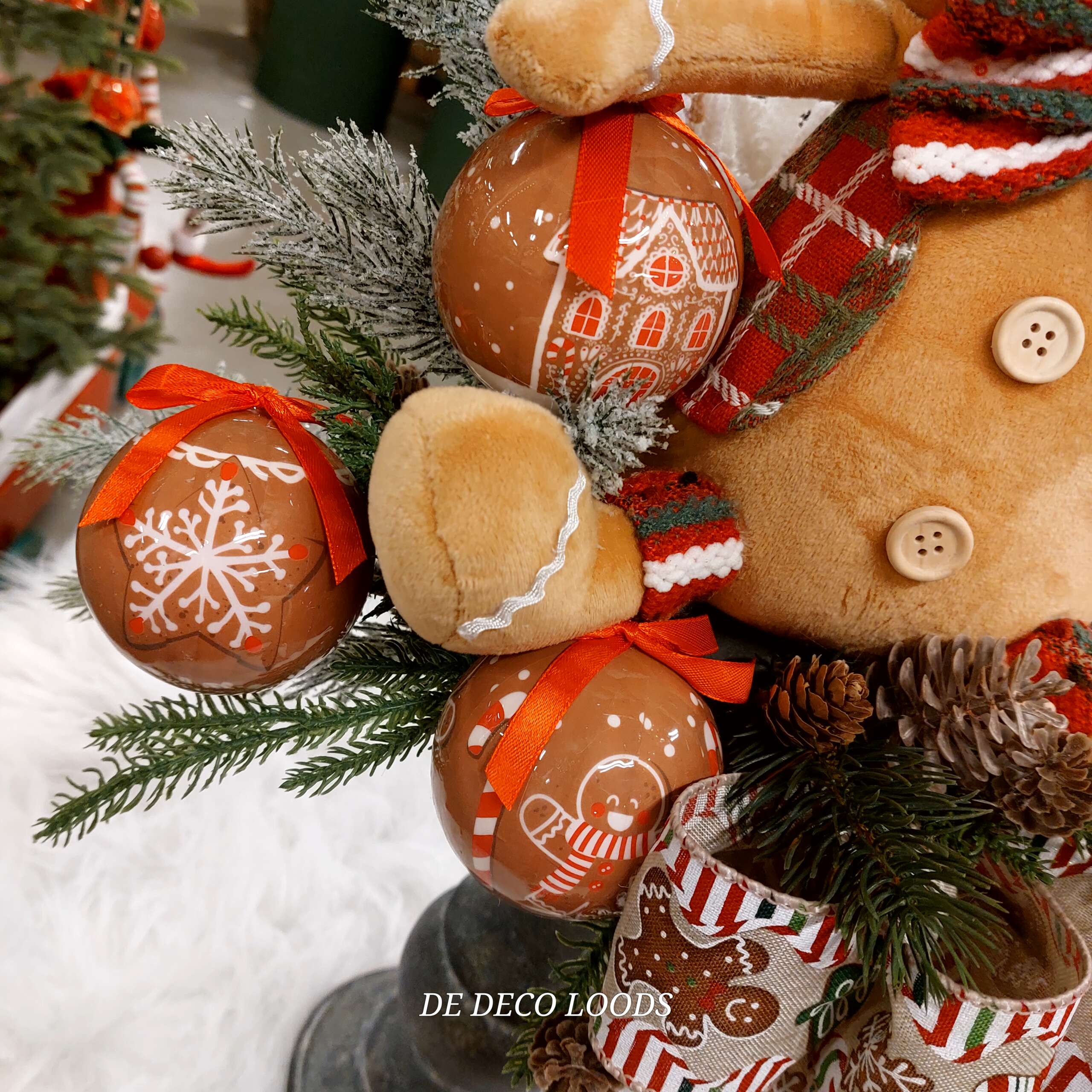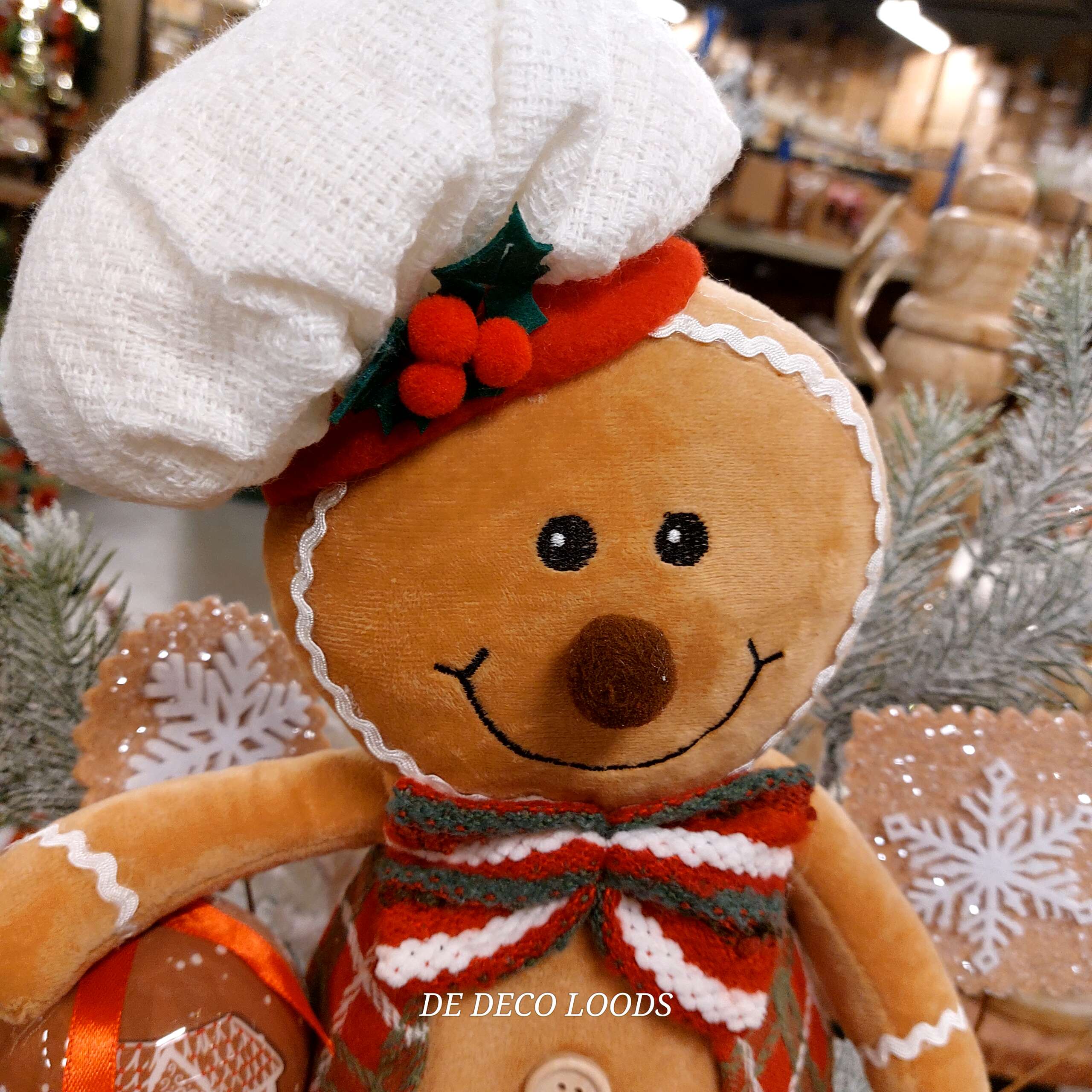 Centraal staat een charmante pluche gingerbread figuur, gekleed als kok met een schattige chef’s hat en een rood-wit-groen gestreepte strik, die een glimlach tovert op ieders gezicht.