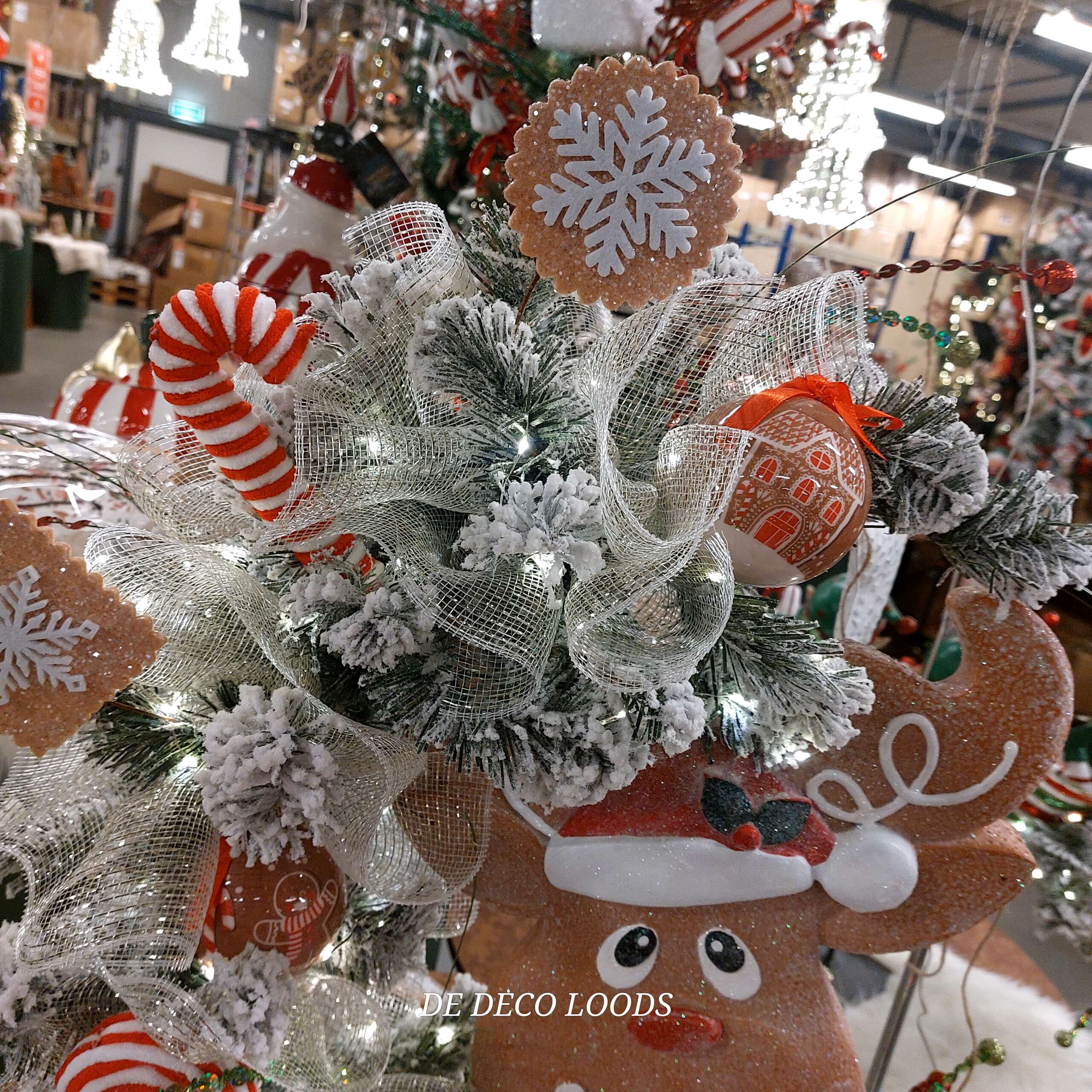Maar het is de combinatie van elementen die deze decoratie echt bijzonder maakt: rondom het rendier vind je een uitbundige mix van licht gouden deco mesh, gingerbread ballen, snoep lollies en zuurstokken, glinsterende cookies, en besneeuwt groen.