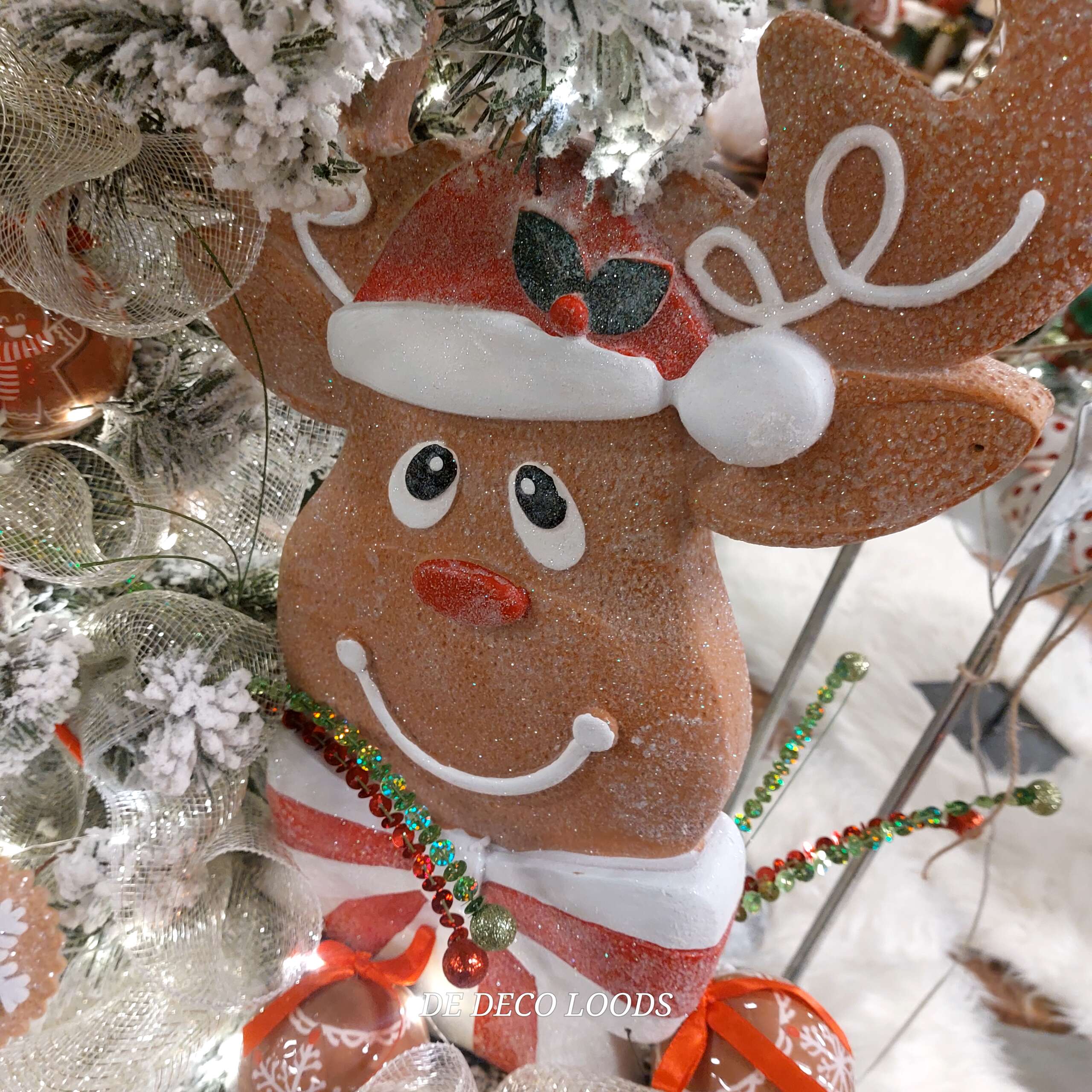 Centraal staat een grote gingerbread rendierkop met een vrolijke uitdrukking, rood/witte sjaal en kerstmuts.