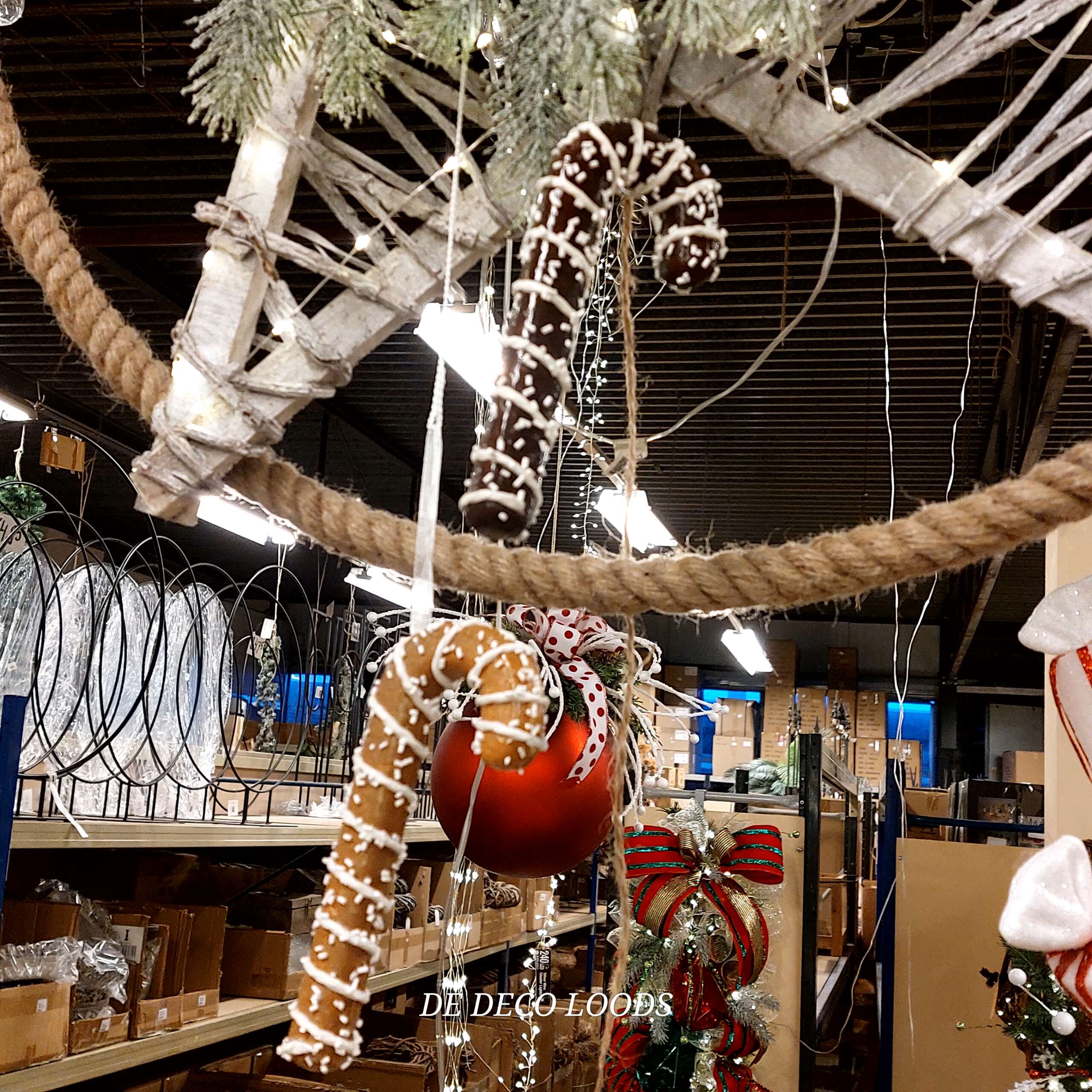 Deze prachtige kerstdecoratie ster van 80 cm is een echte blikvanger voor de feestdagen. De ster is stijlvol verwerkt in een stevige jute touwring en voorzien van een decoratieve toef groen, aangevuld met speelse gingerbread hangers en klassieke candy canes. Het geheel wordt afgewerkt met een feestelijk lint, waardoor de ster een warme en nostalgische uitstraling krijgt.