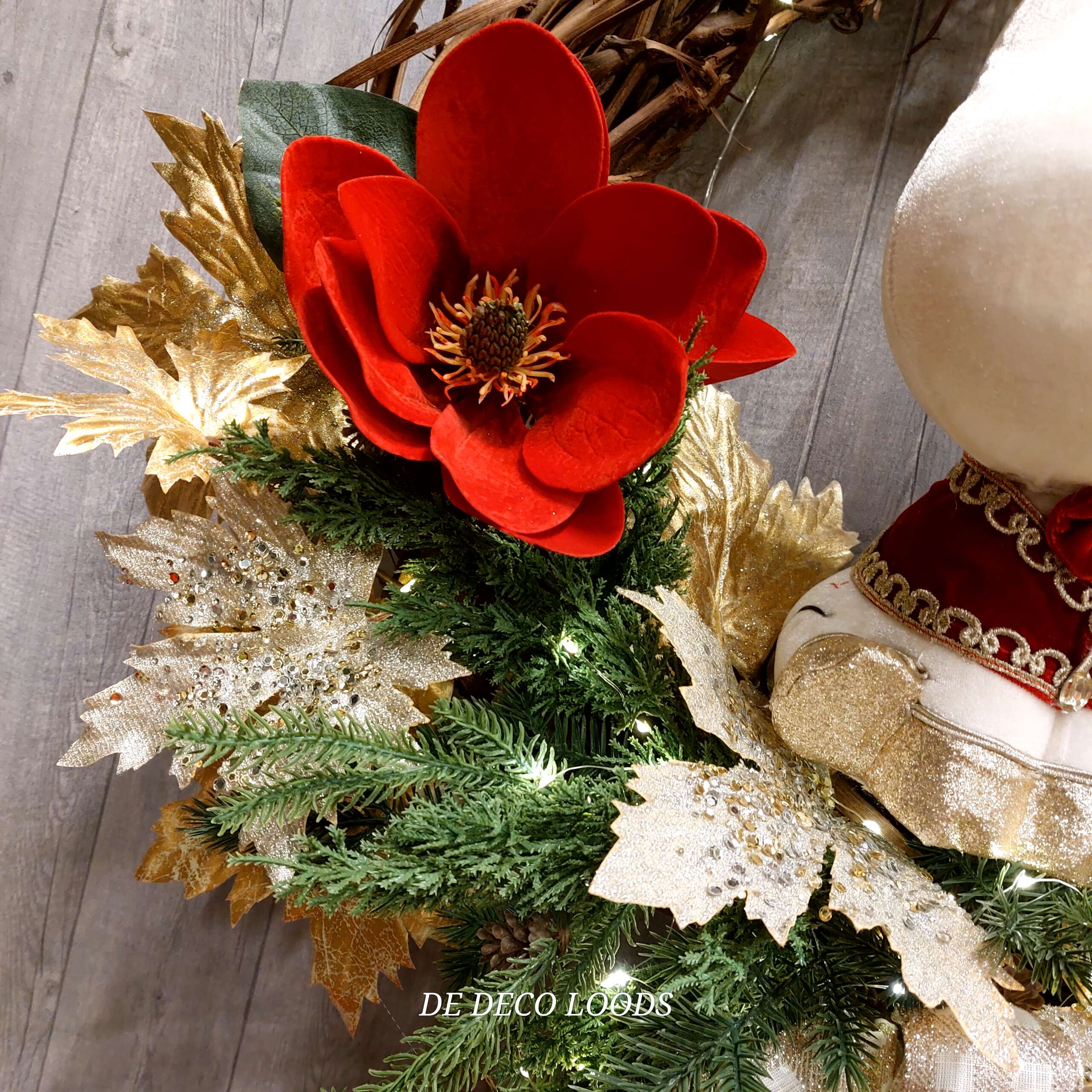 Deze royale krans van 60 cm is gemaakt van een stevige grapevine basis en aan de onderkant versierd met groene zijden dennentakken, magnolia in velvet rood, gouden blad takken die in stukken zijn geknipt en een luxe wired ribbon waar je een geweldige strik mee kunt maken. Red nose reindeer, is natuurlijk de blikvanger van deze krans.