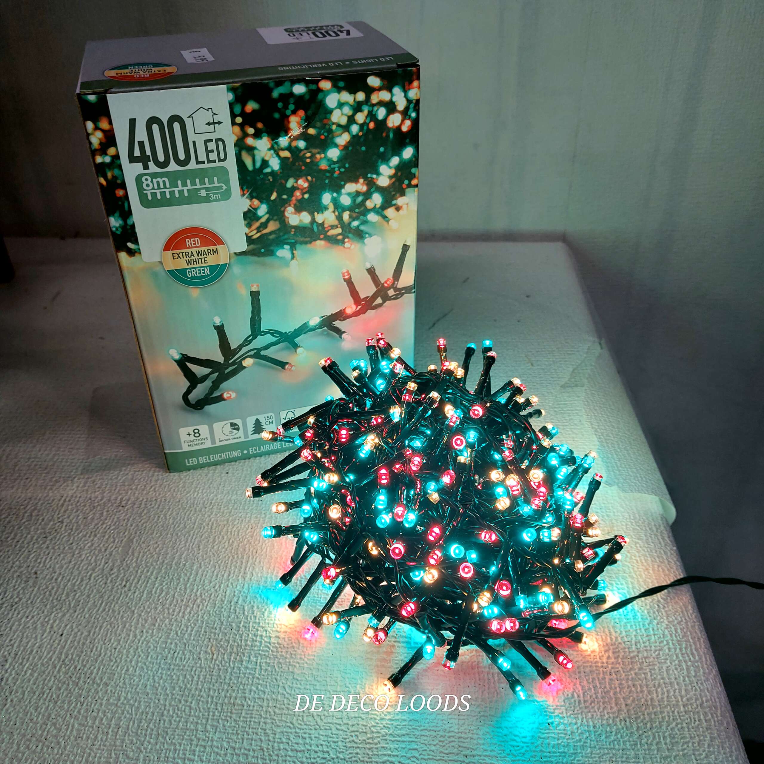 Led verlichting 400 is 8mt lang en heeft 400 led’s in de kleur rood geel en groen.