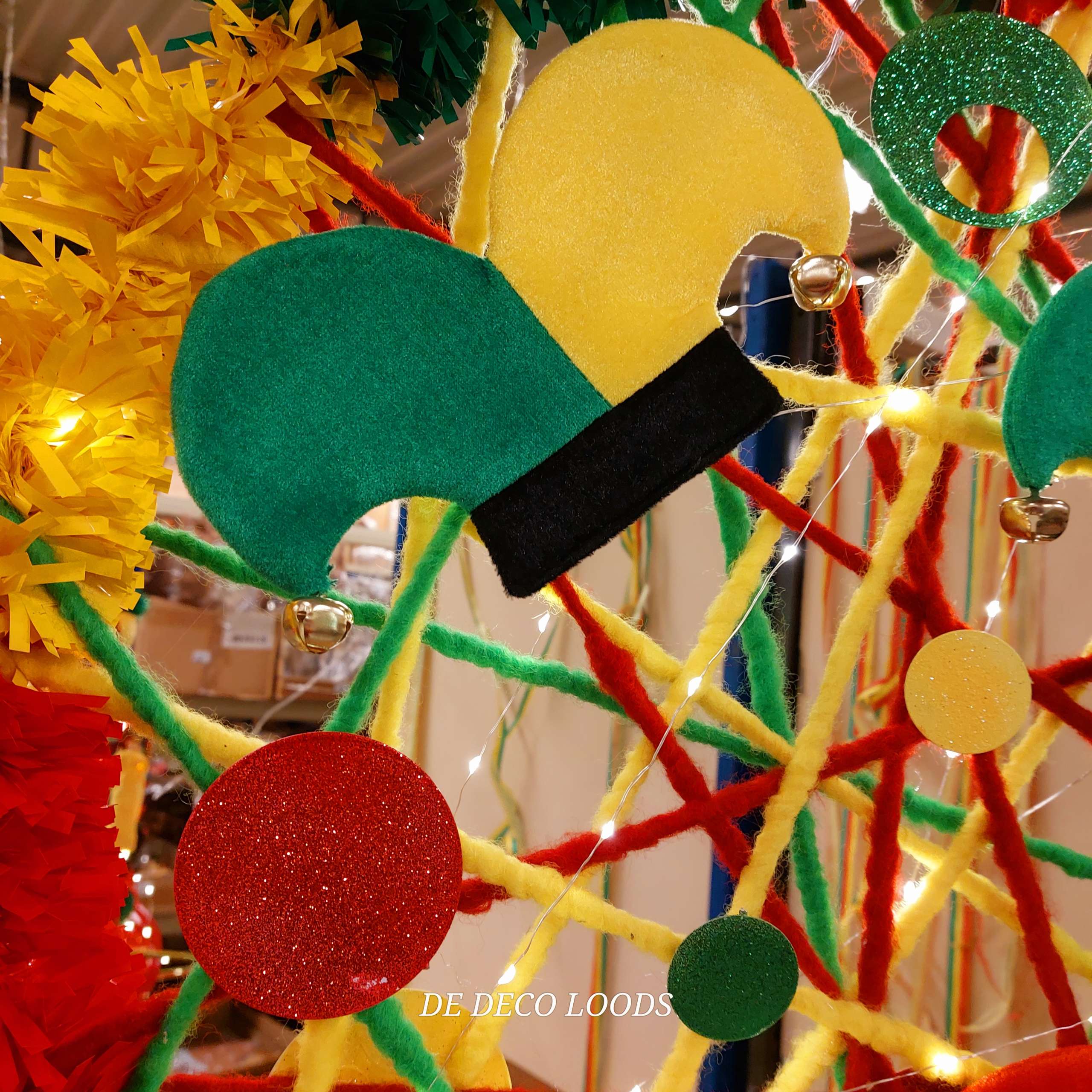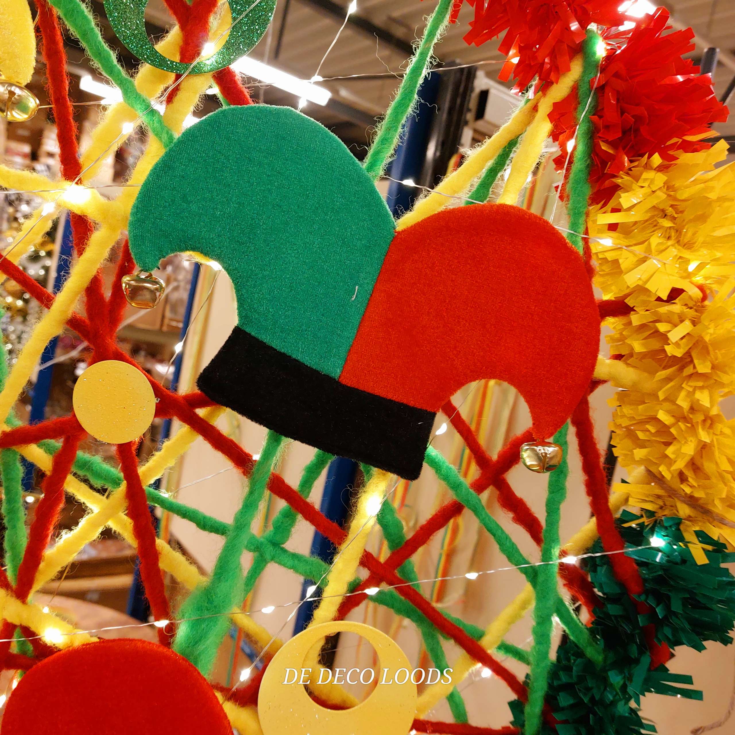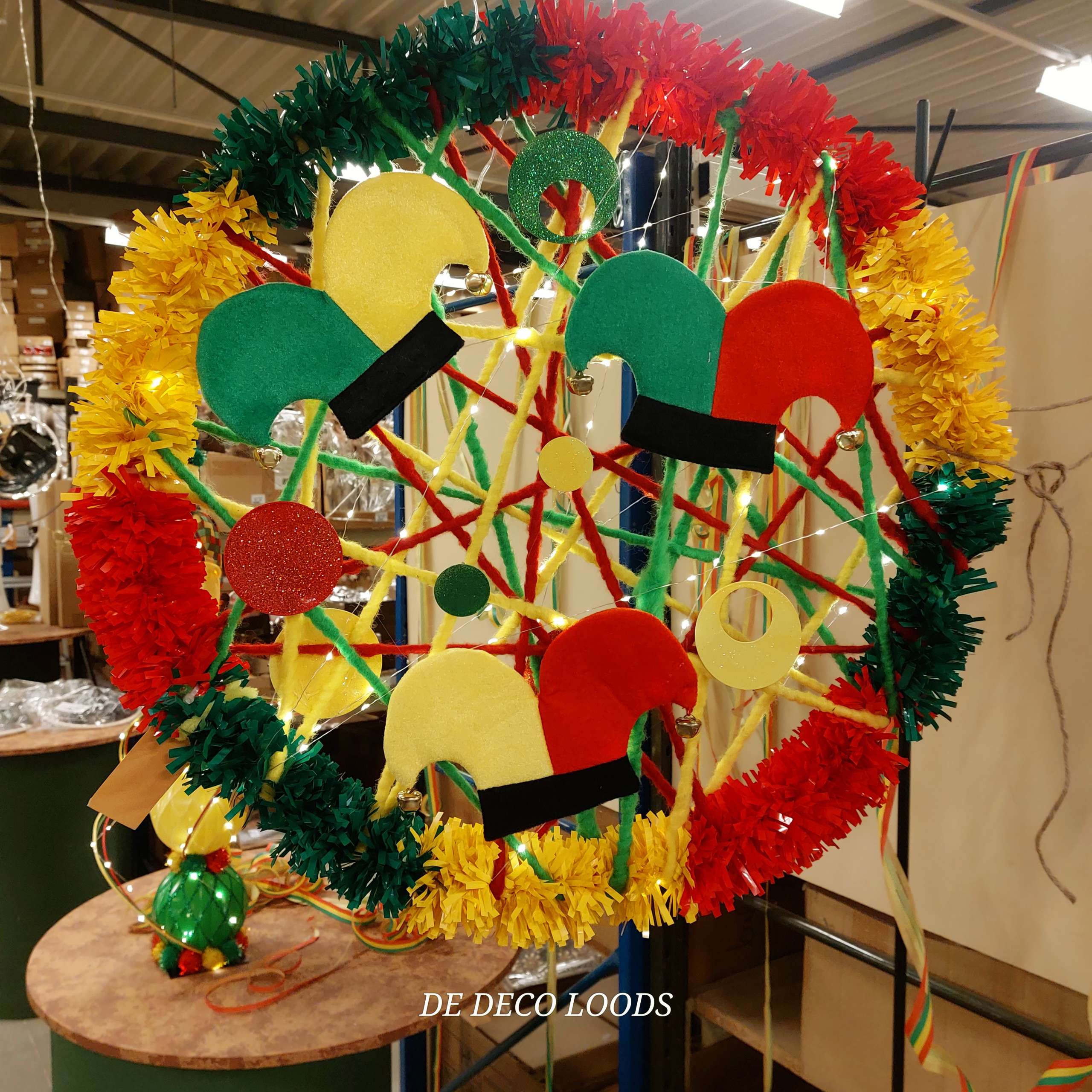Narrenmutsen ring. De 60 cm ring is omwikkeld met een stroken‑slinger in rood, geel en groen — alsof carnaval er persoonlijk een warme knuffel aan heeft gegeven. Binnenin slingert een bont wolkoord in carnavalskleuren, waar vrolijke narrenkappen op zitten die je bijna hoort roepen: “Alaaf, hang ons op!”