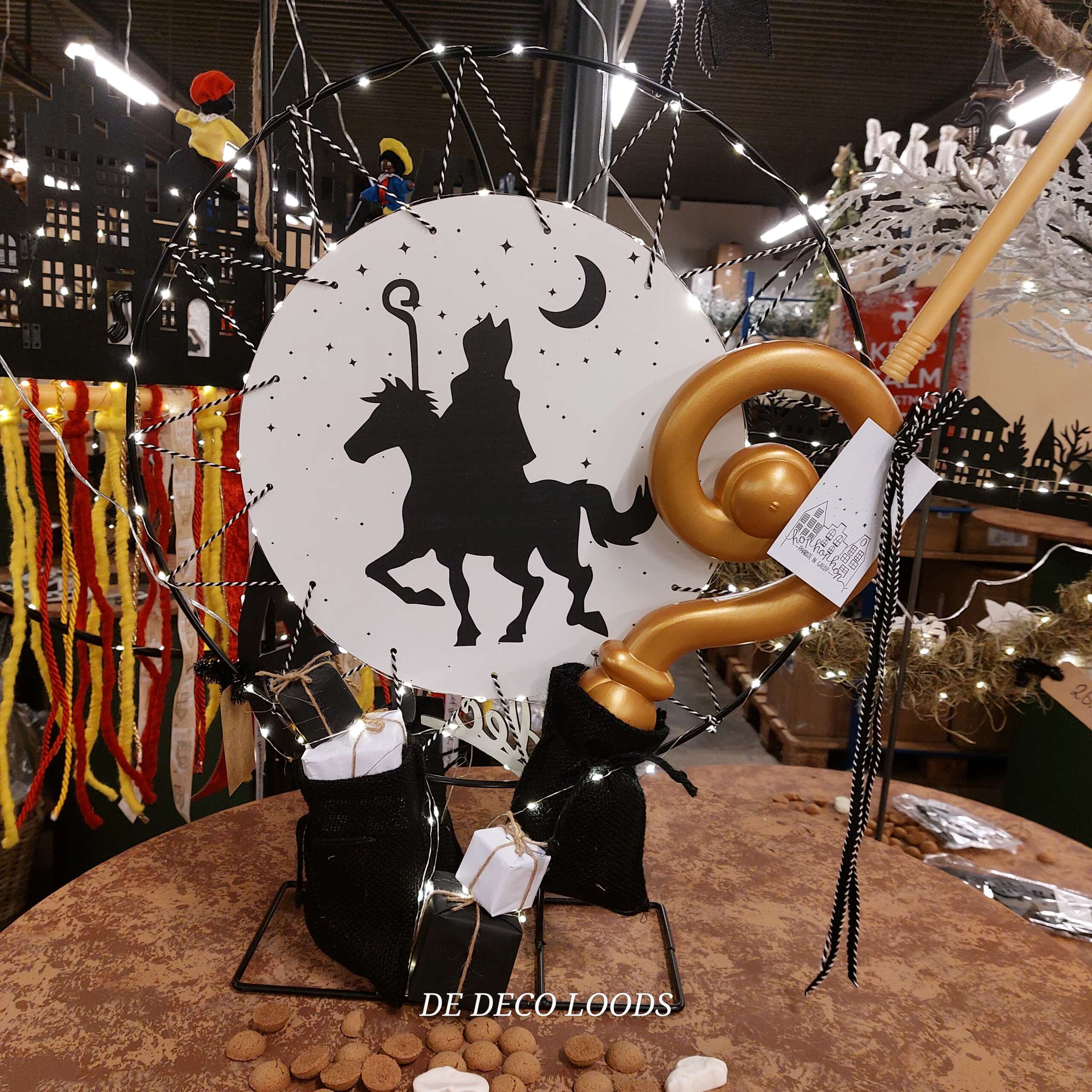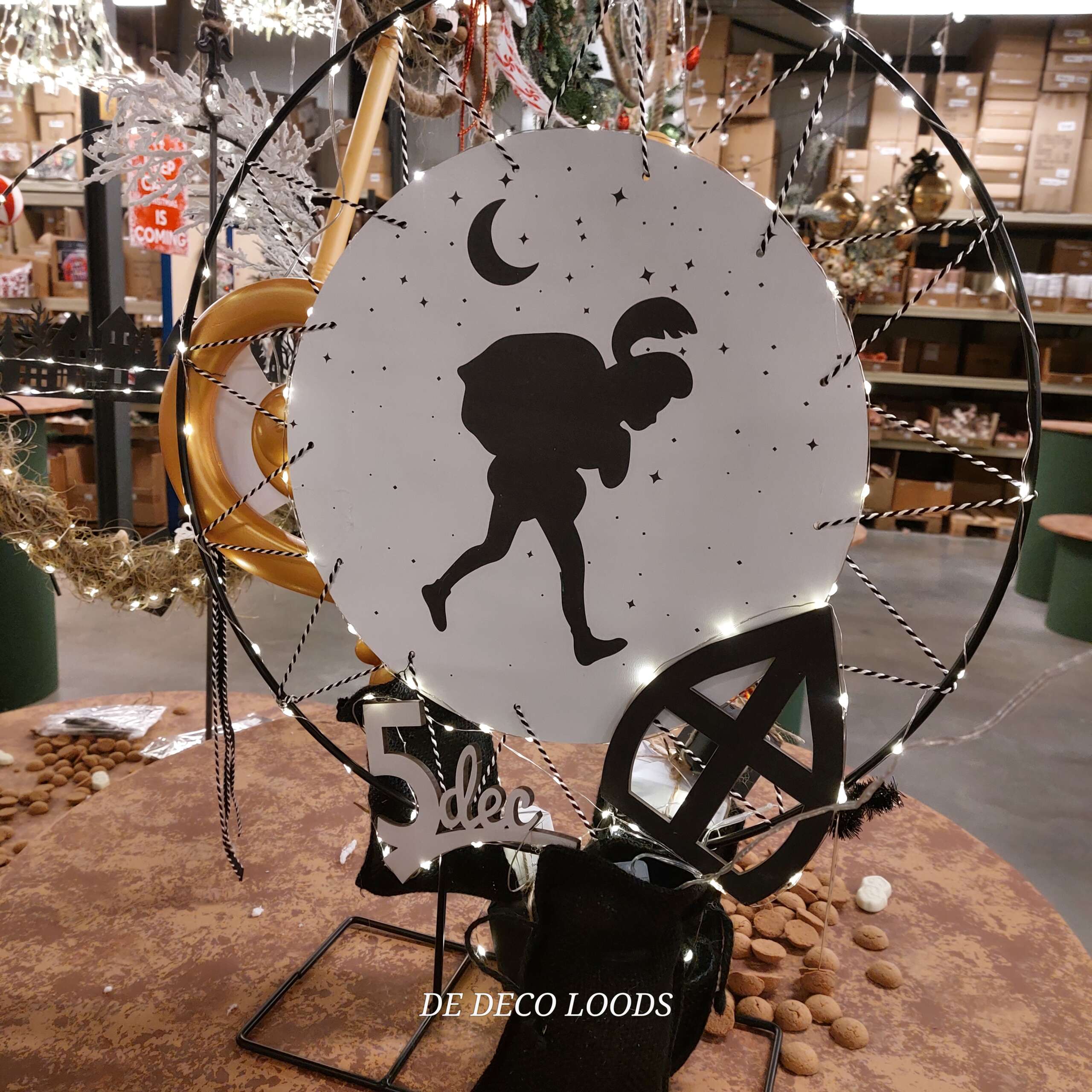 Het frame is rijkelijk versierd met zwarte jute zakjes en zwart-witte cadeautjes, wat zorgt voor een speels en feestelijk effect.