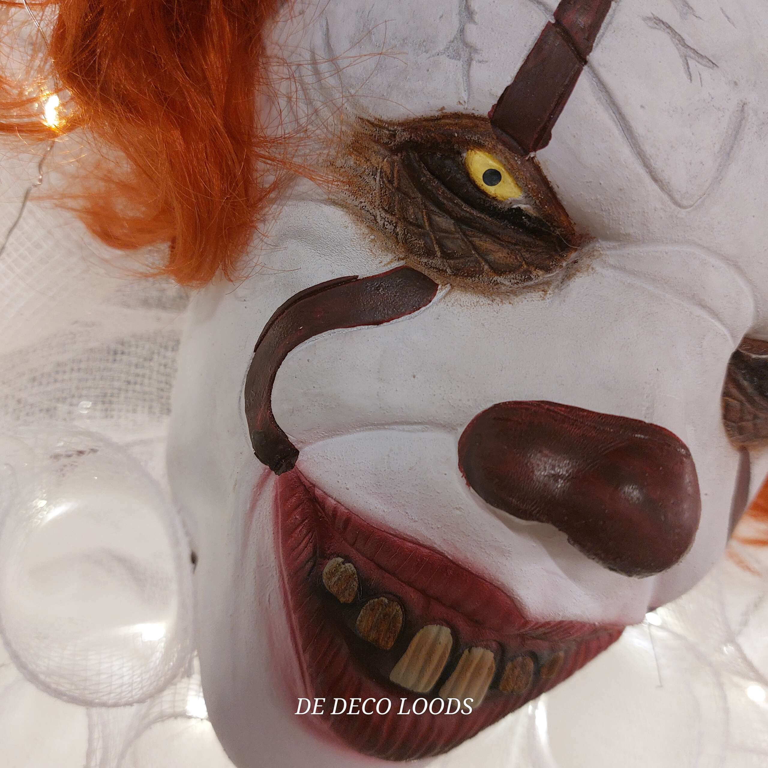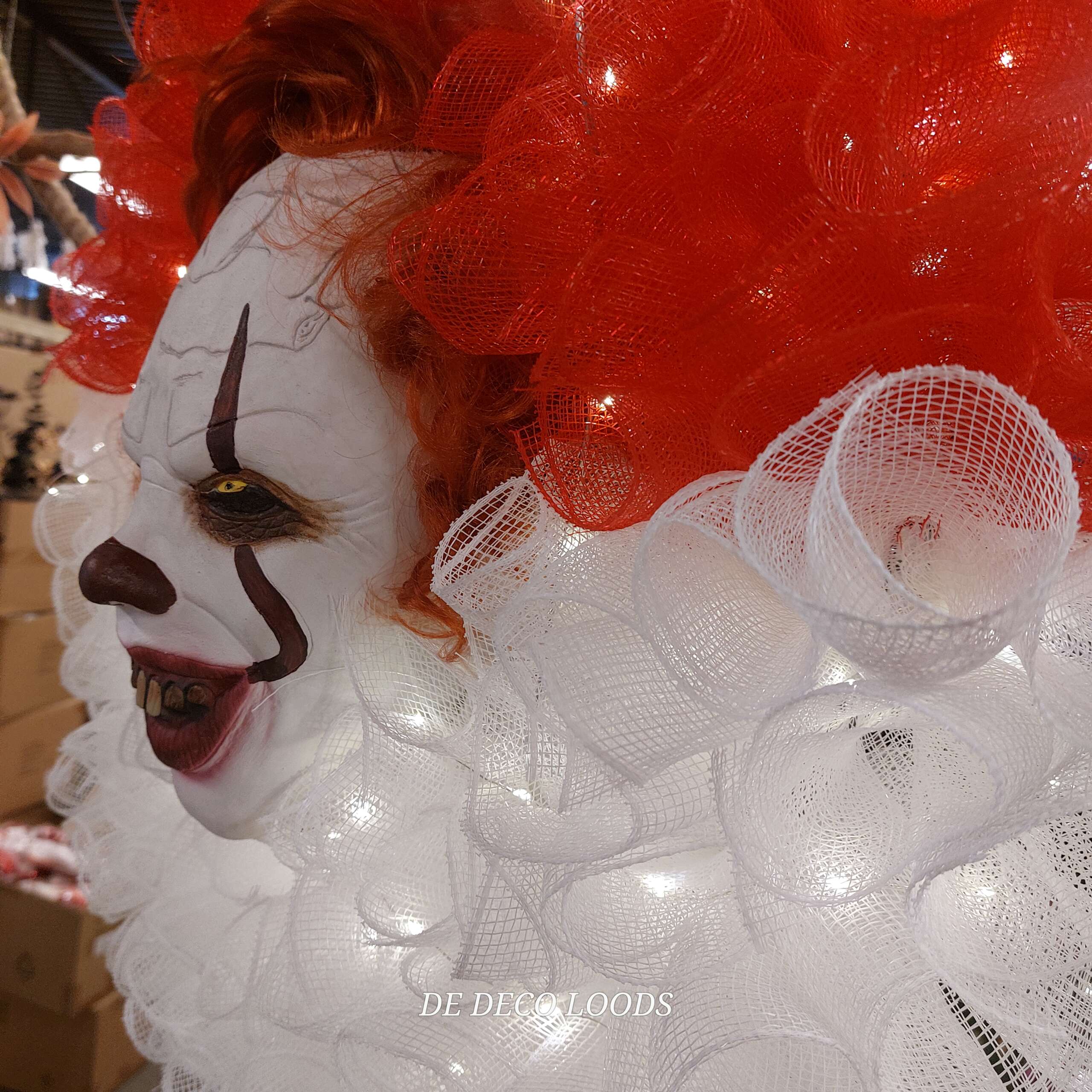Pennywise, de clown uit de film It. De clown zit als 3-D versie in de krans met een ballon erboven.