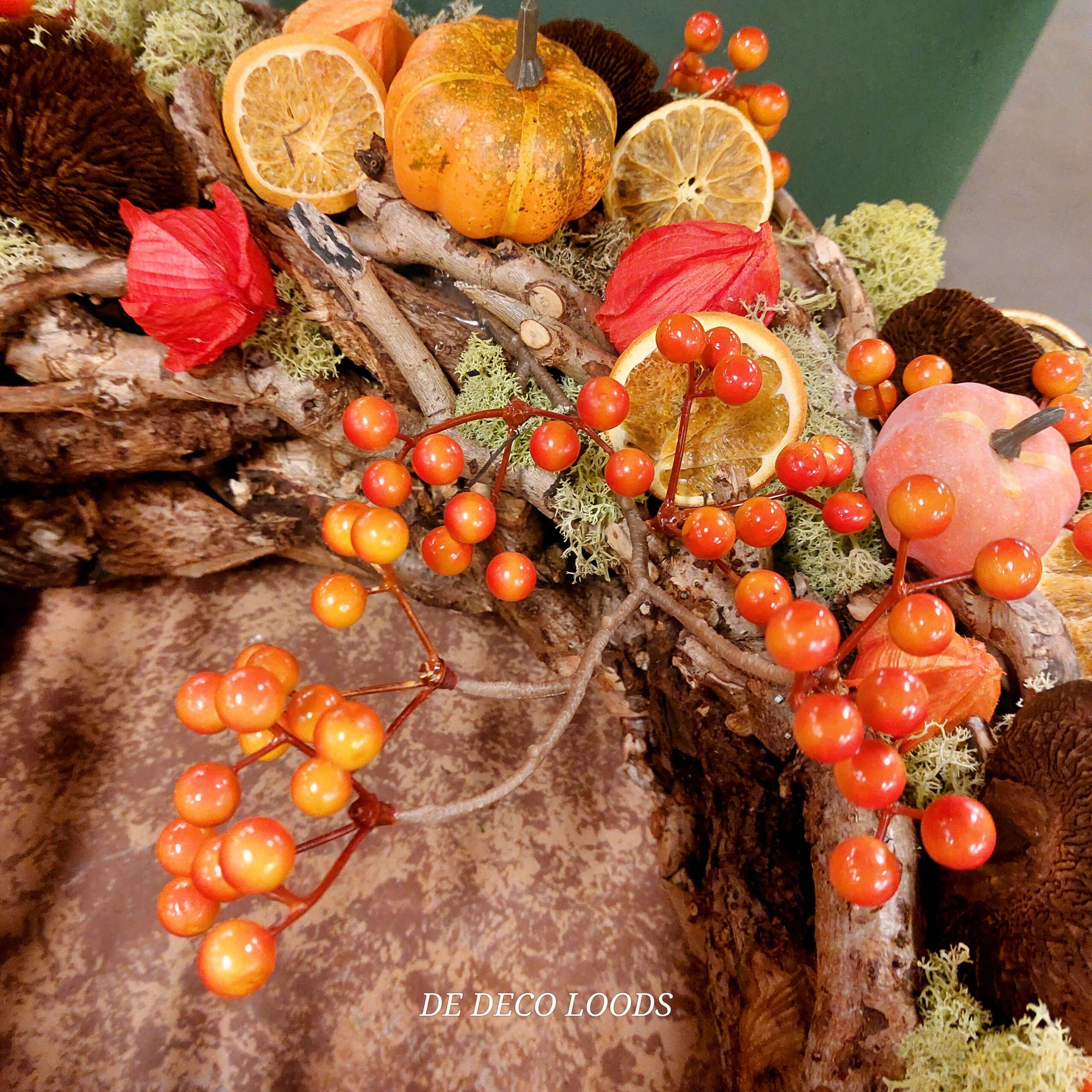 - Decoratie: Rijkelijk versierd met diverse herfstmaterialen zoals: