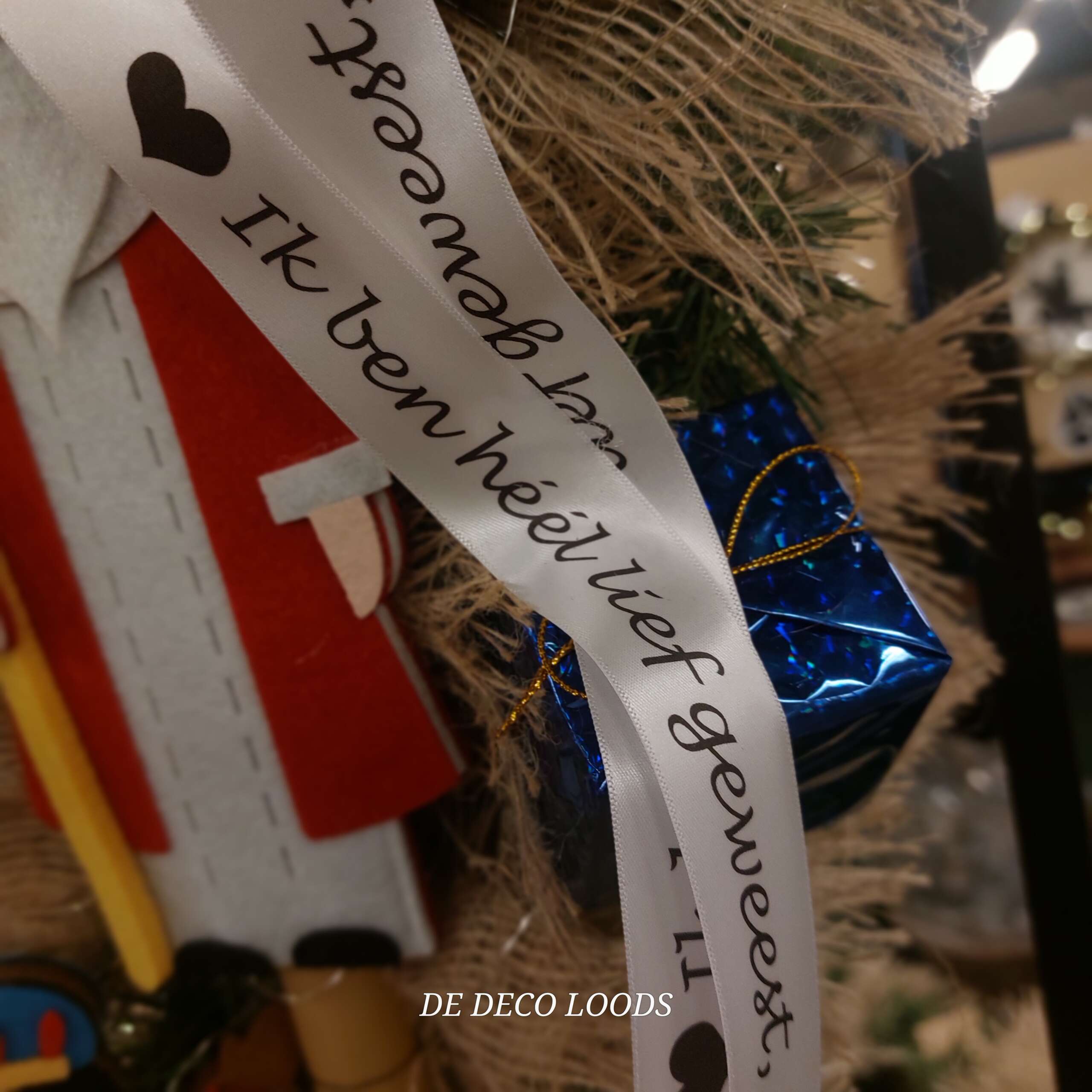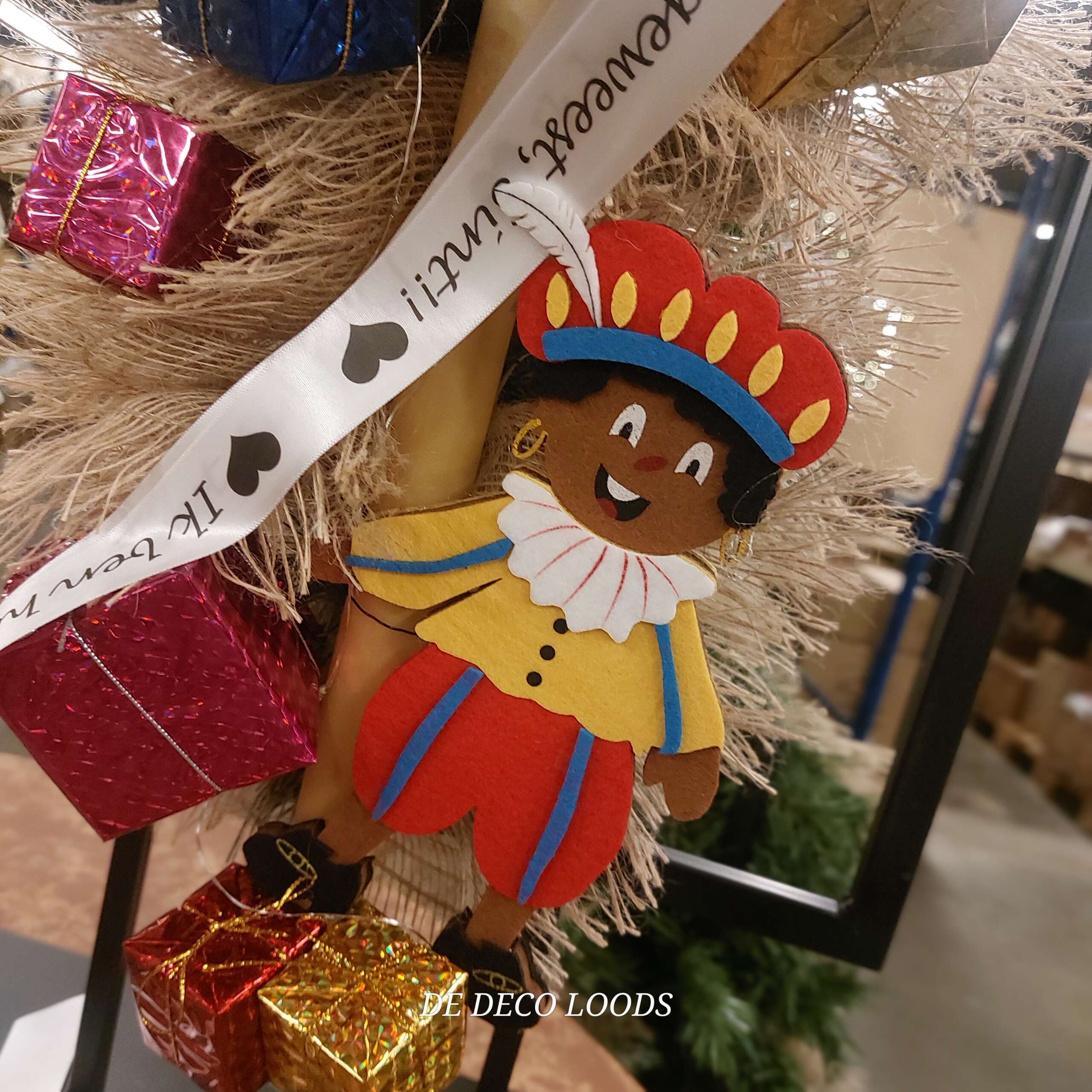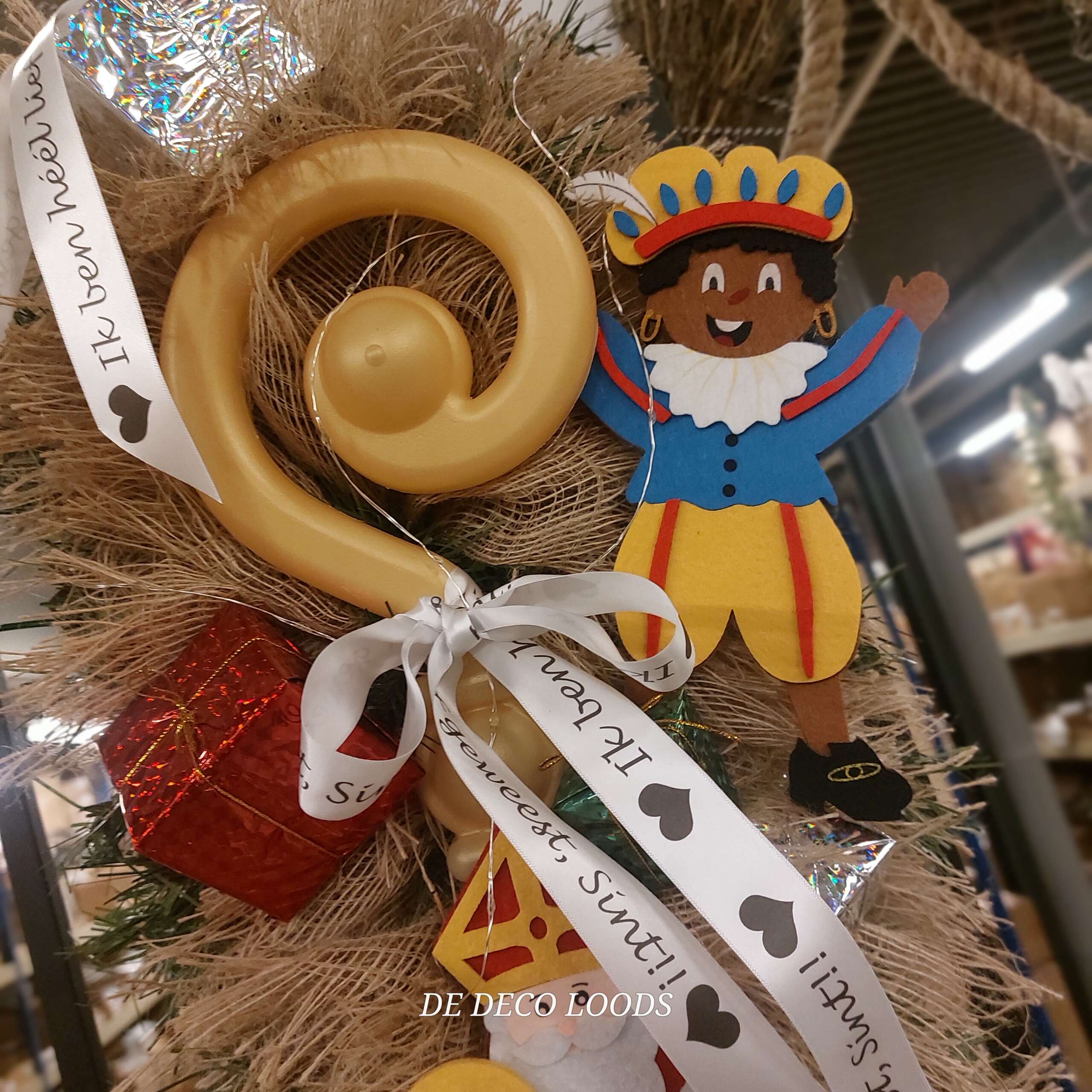Sinterklaas deurhanger decoratie. Breng de magie van Sinterklaas tot leven met deze sfeervolle deurhanger van ca. 90 cm lang. Gemaakt met Deco Mesh, speelse franjes en feestelijke elementen zoals Pietjes, stafjes en kadootjes van folie. Een echte blikvanger voor je voordeur, muur of etalage!