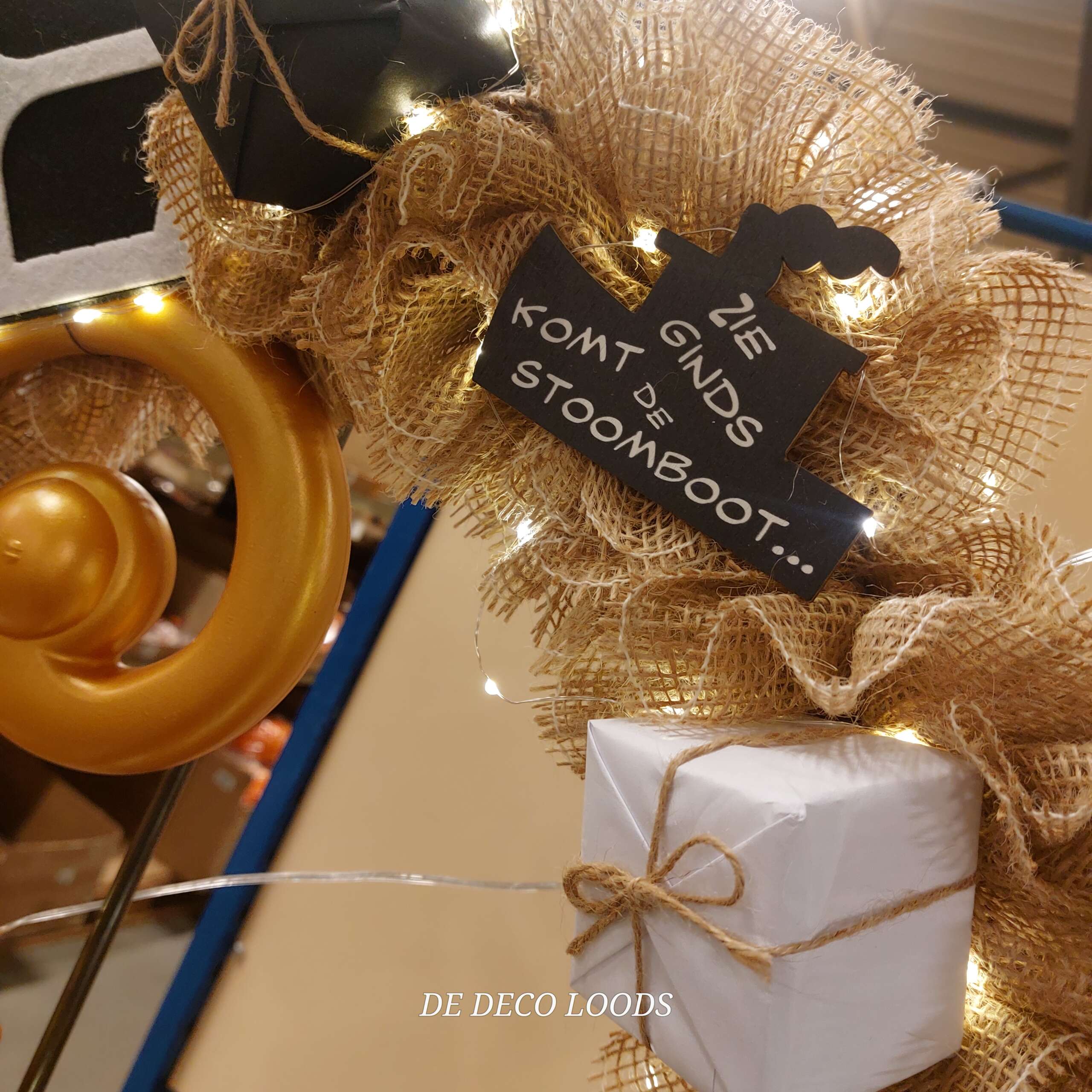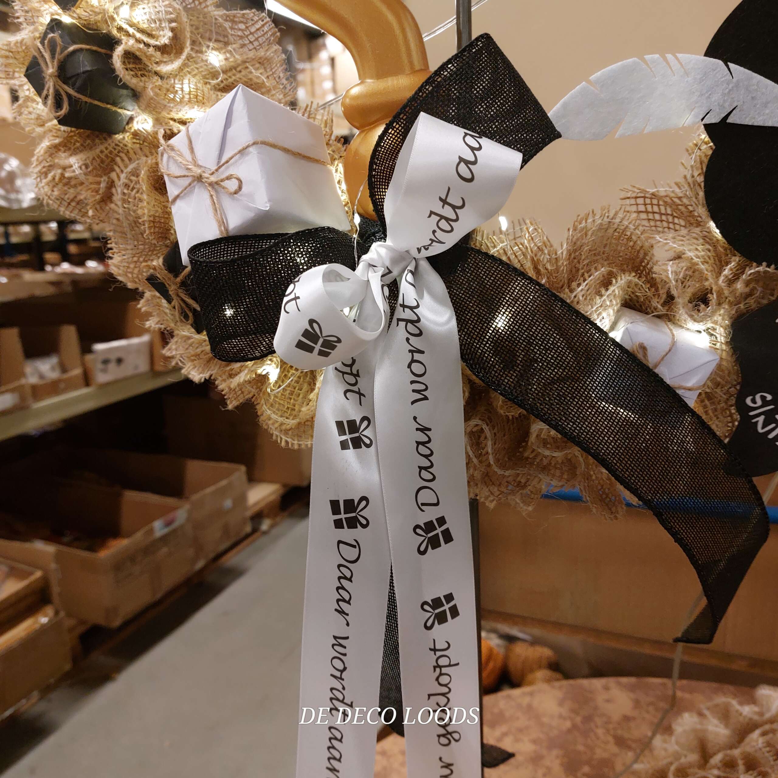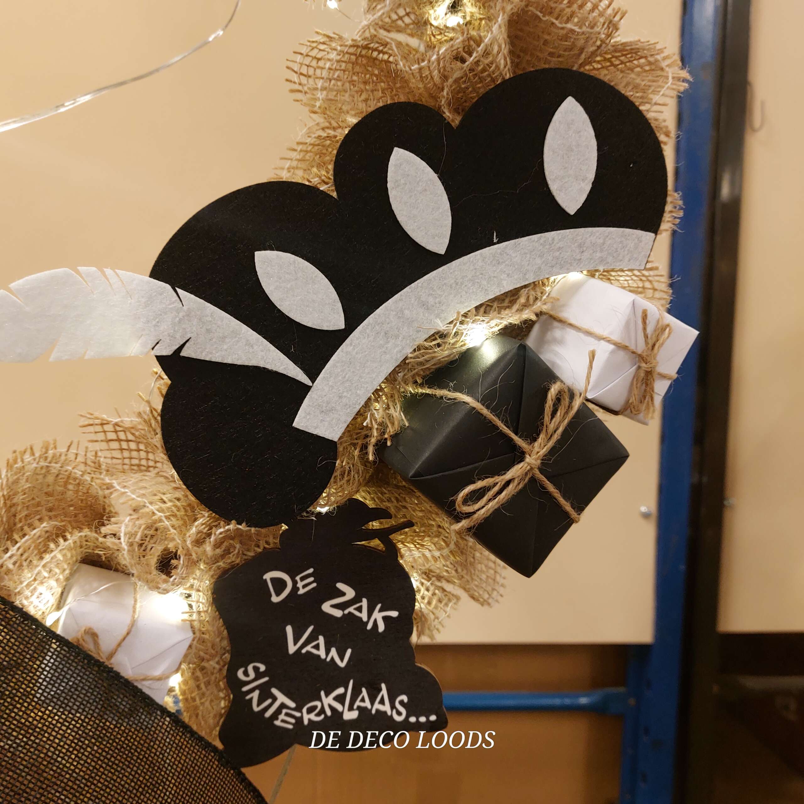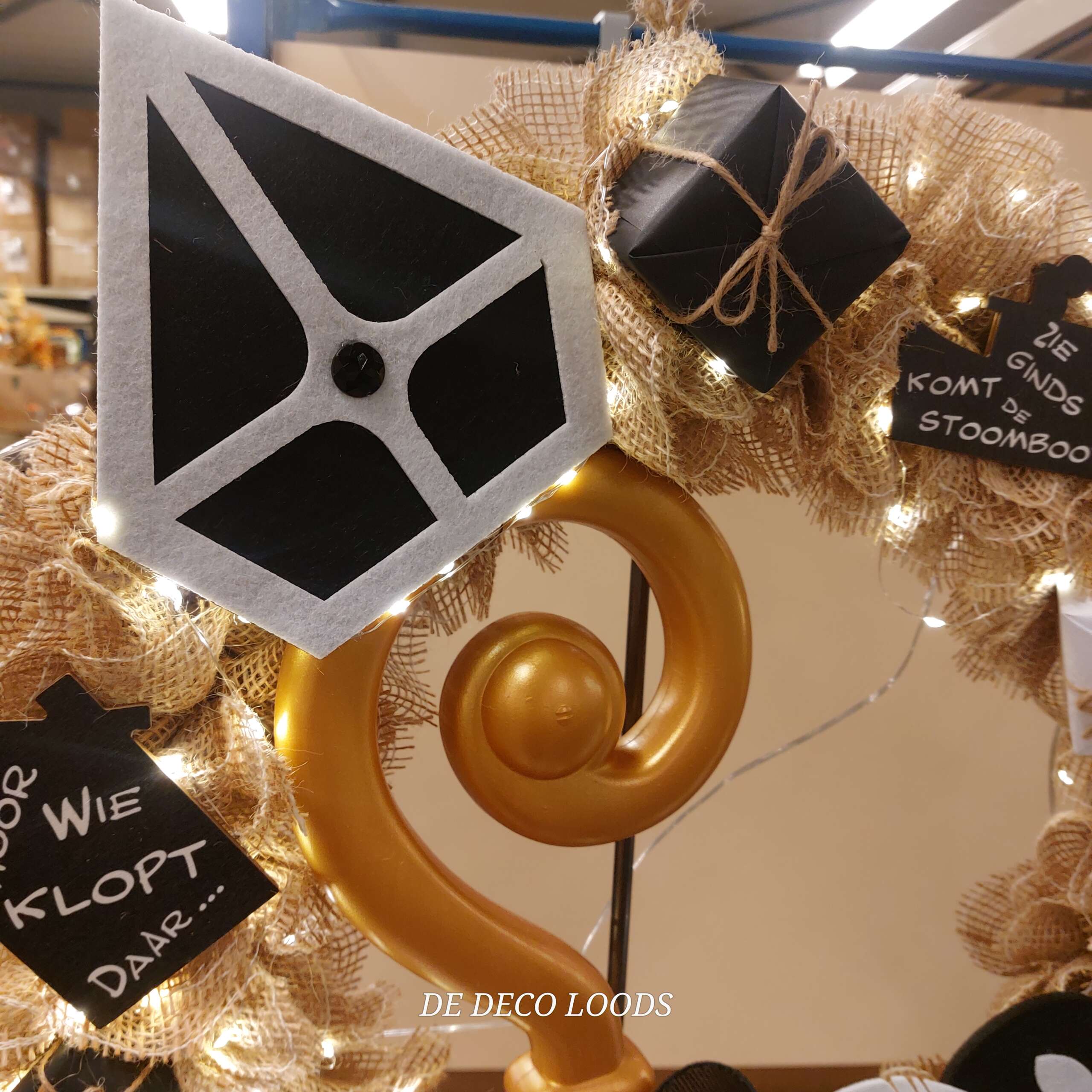 De krans is voorzien van diverse zwart-witte accessoires in Sinterklaasstijl, waaronder een korte krulstaf.