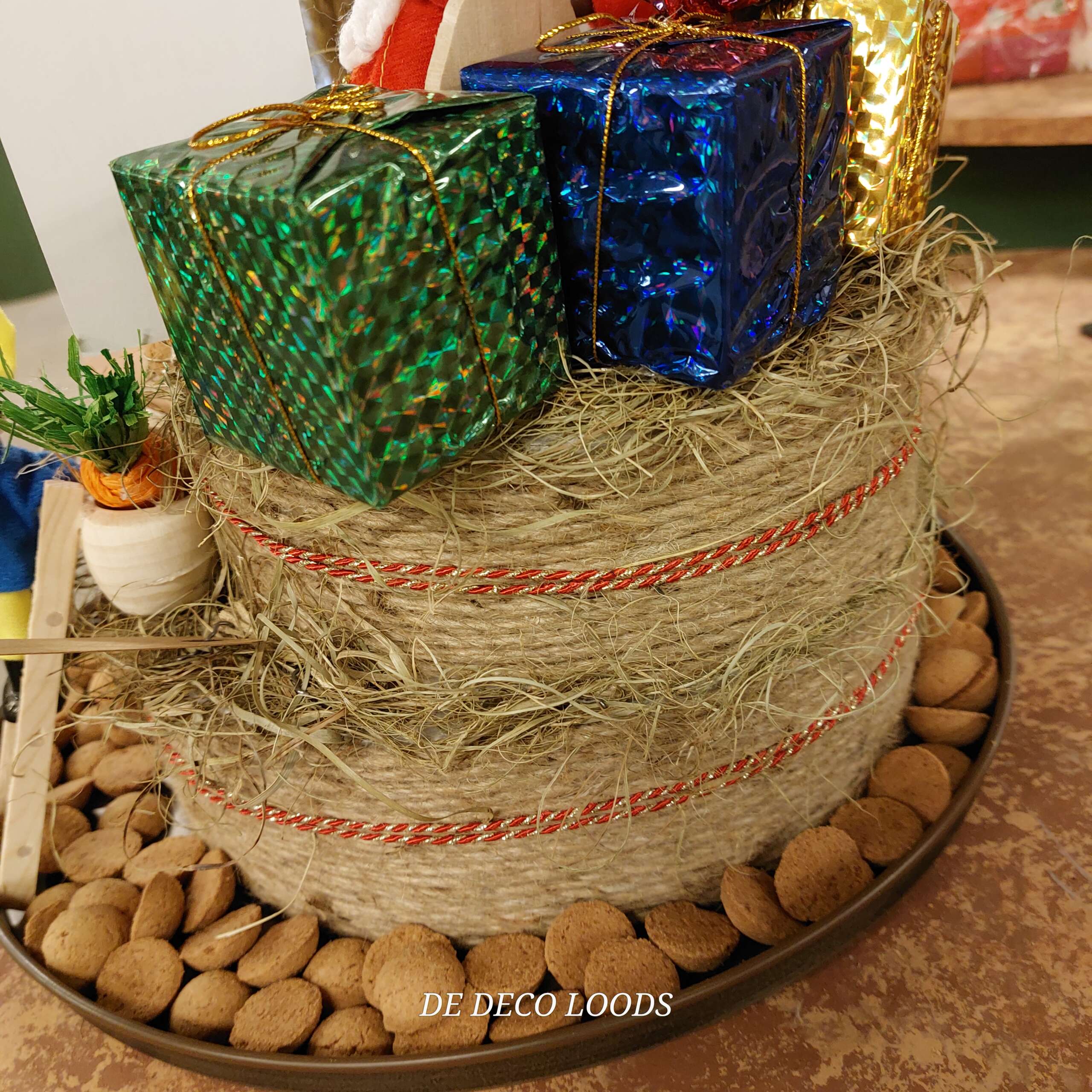 De taart is omwikkeld met touw en rijkelijk versierd met miniaturen van Sinterklaas in zijn fauteuil, vrolijke Pieten, Ozosnel, klompjes, zakjes, wortels en laddertjes.