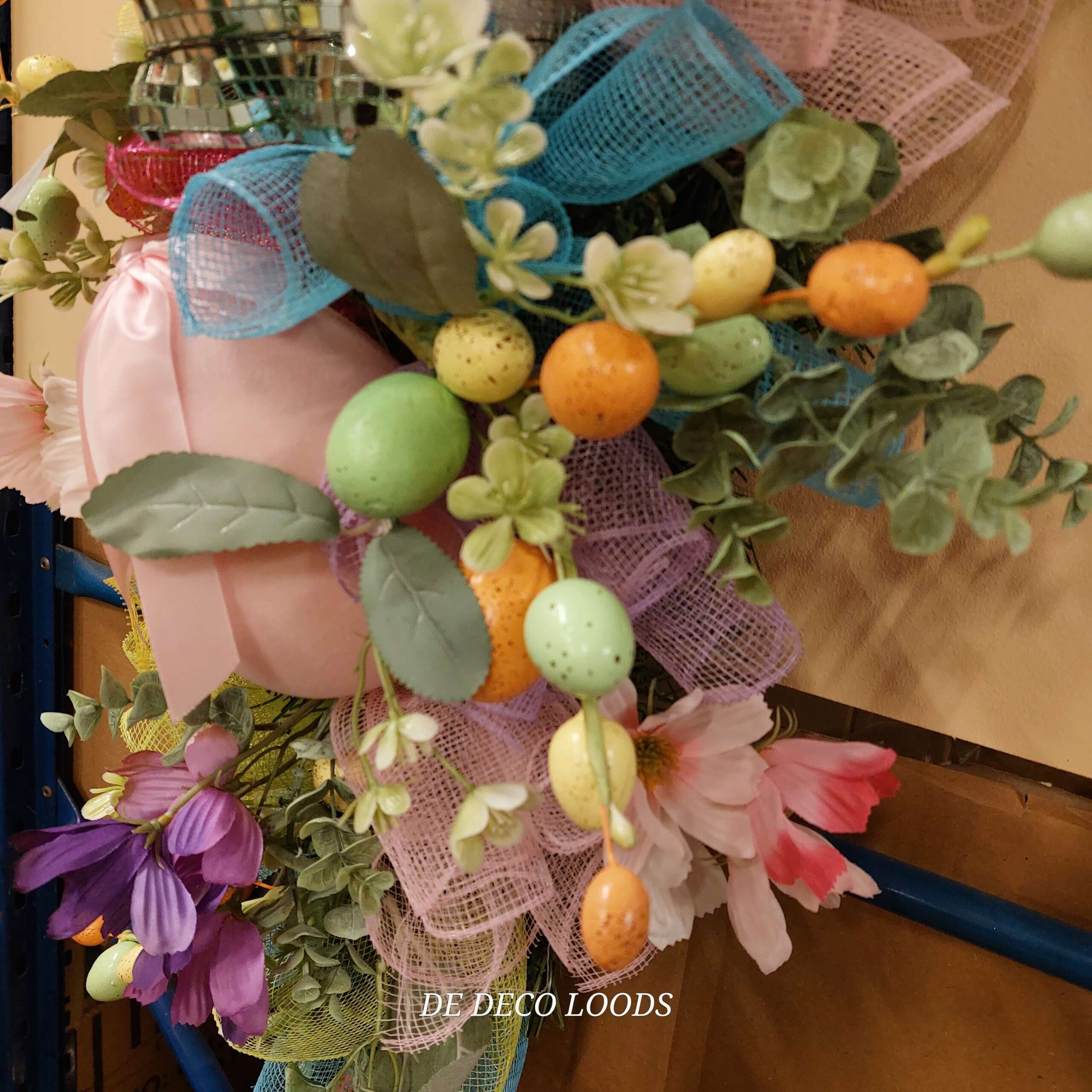 De deurhanger is bewerkt met decomesh in zes kleuren. Er zitten 2 flock eieren in van 15cm hoog. Met de kleurrijke bloemen en eitjes takjes. En als middelpunt de spiegel bunny, opgebouwd uit allemaal kleine spiegeltjes in de kleur mint. De bunny is 45cm hoog.