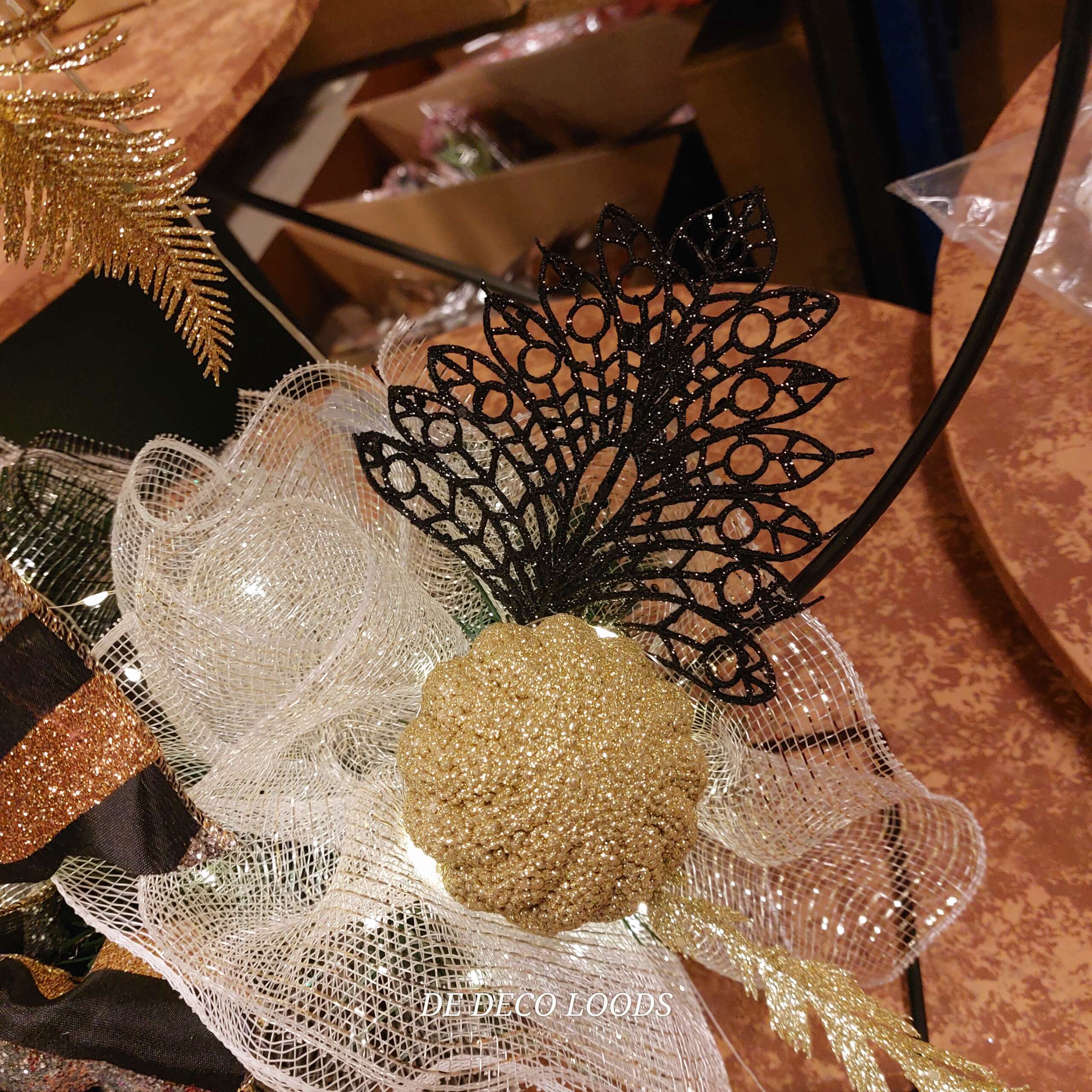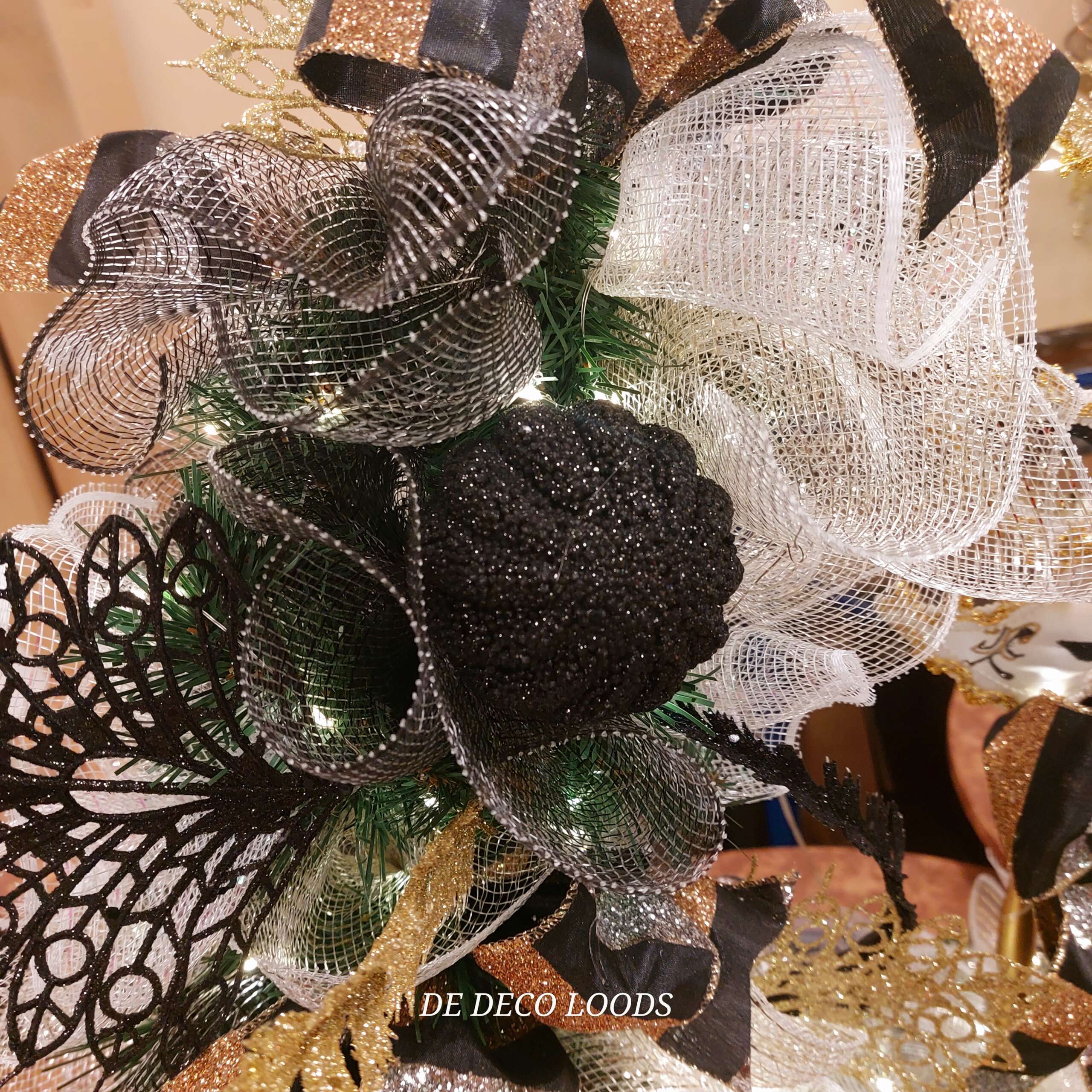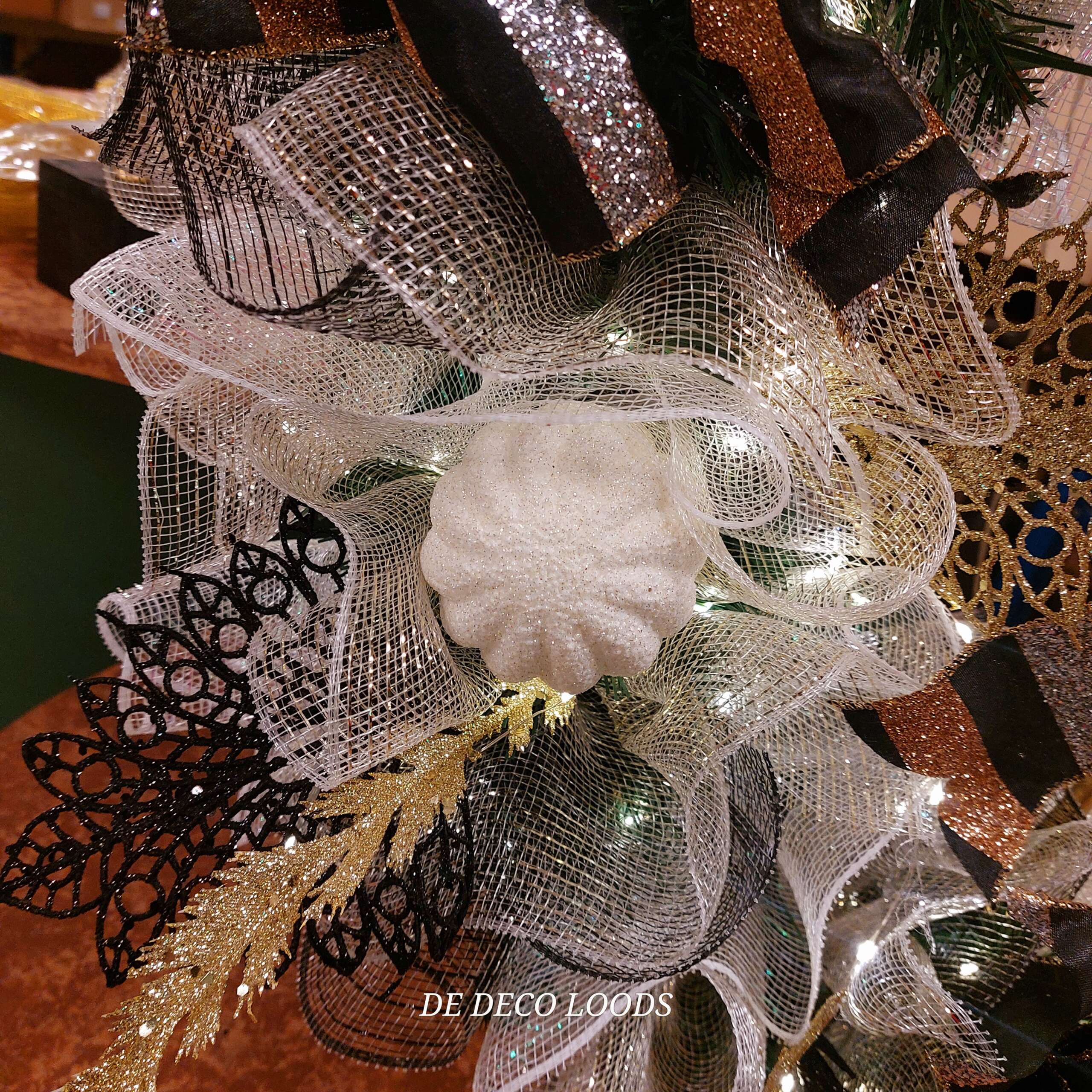 De ring is volledig bewerkt met hoogwaardige deco mesh in tinten zwart, wit en goud , zorgvuldig geplooid en gelaagd voor een volumineus en dynamisch effect. In de mesh zijn glittertakken in goud en zwart verwerkt, die het licht vangen en zorgen voor een sprankelende uitstraling. Decoratieve ballen in bijpassende kleuren zorgen voor extra diepte en feestelijke flair.