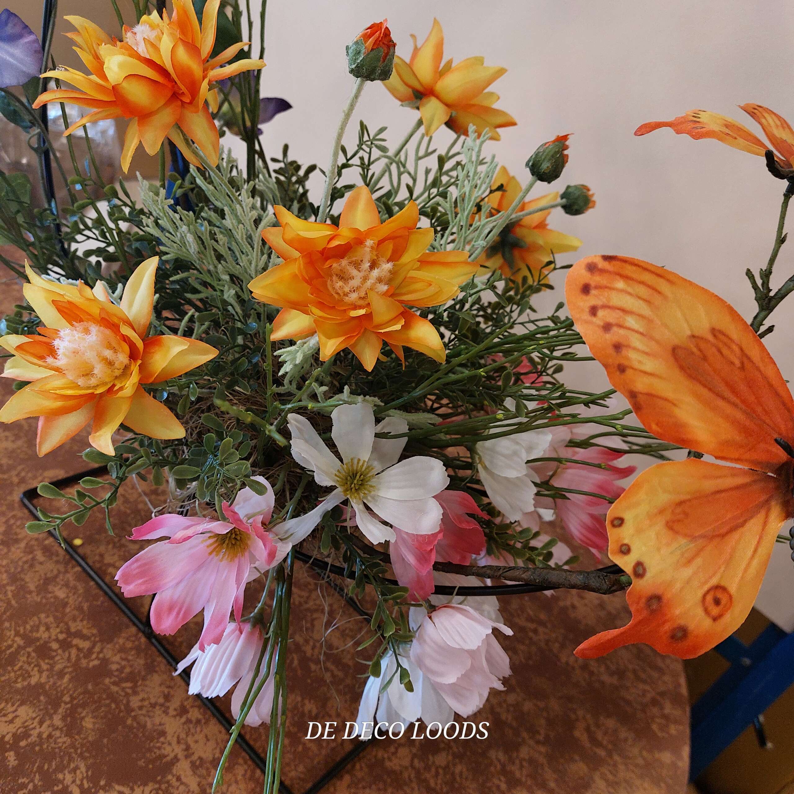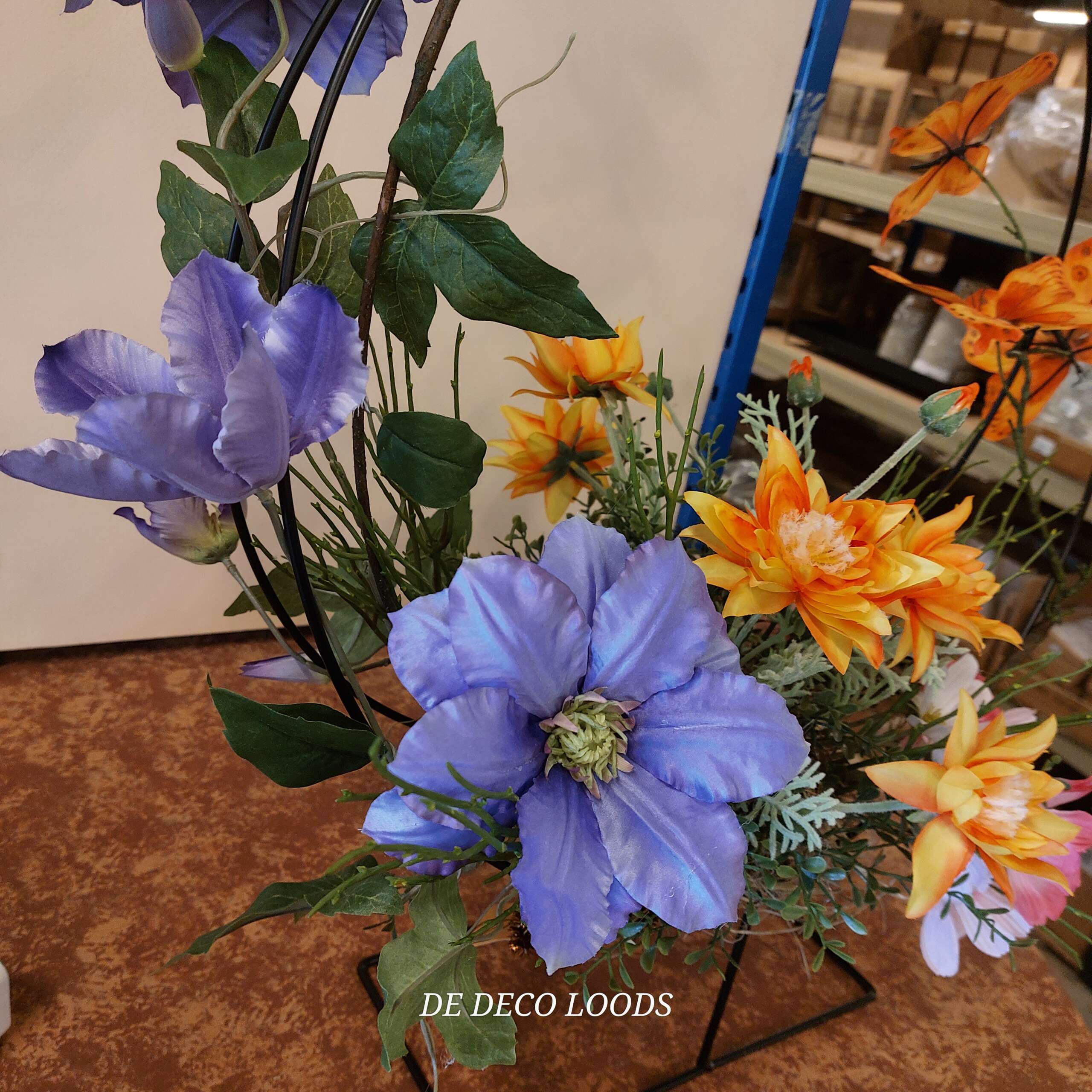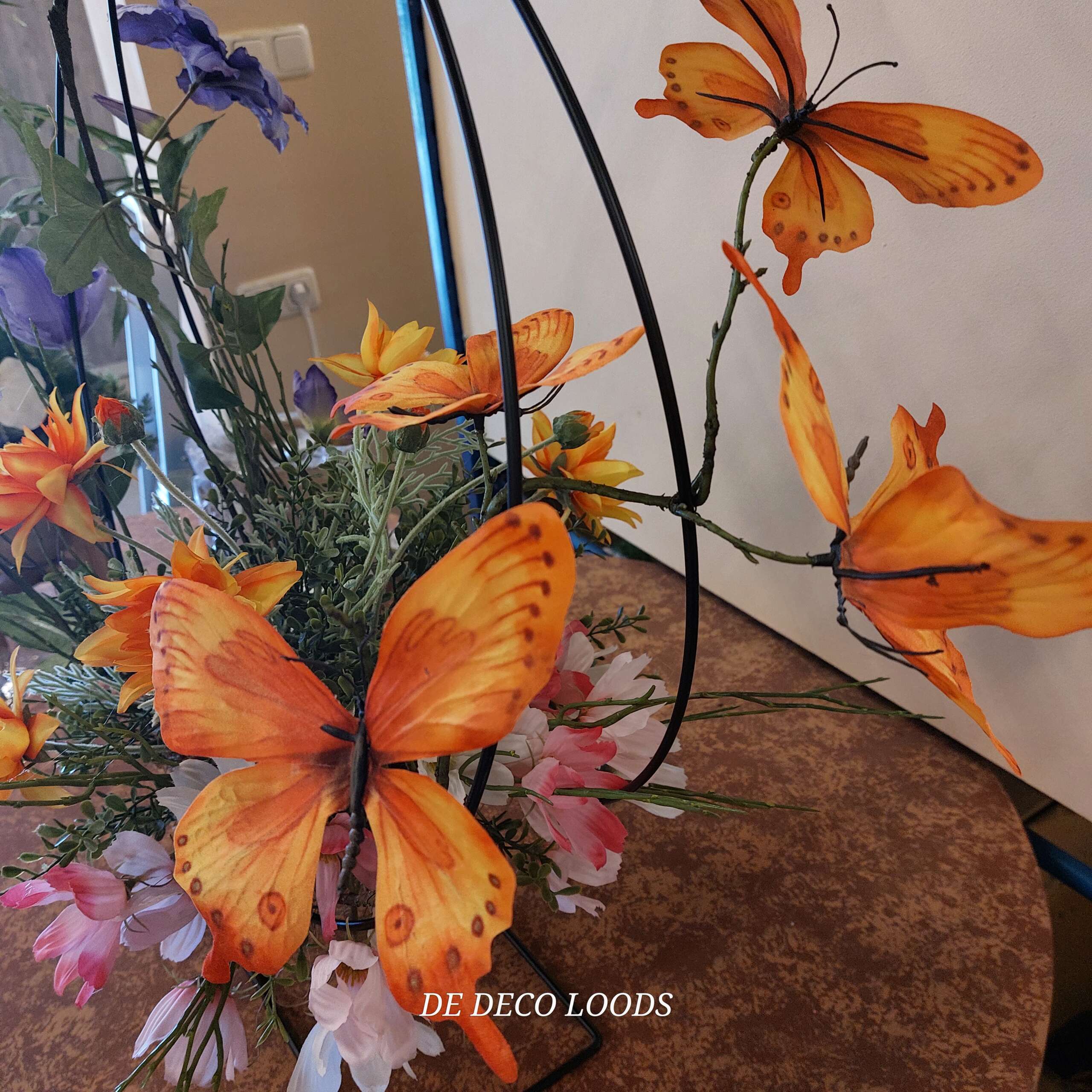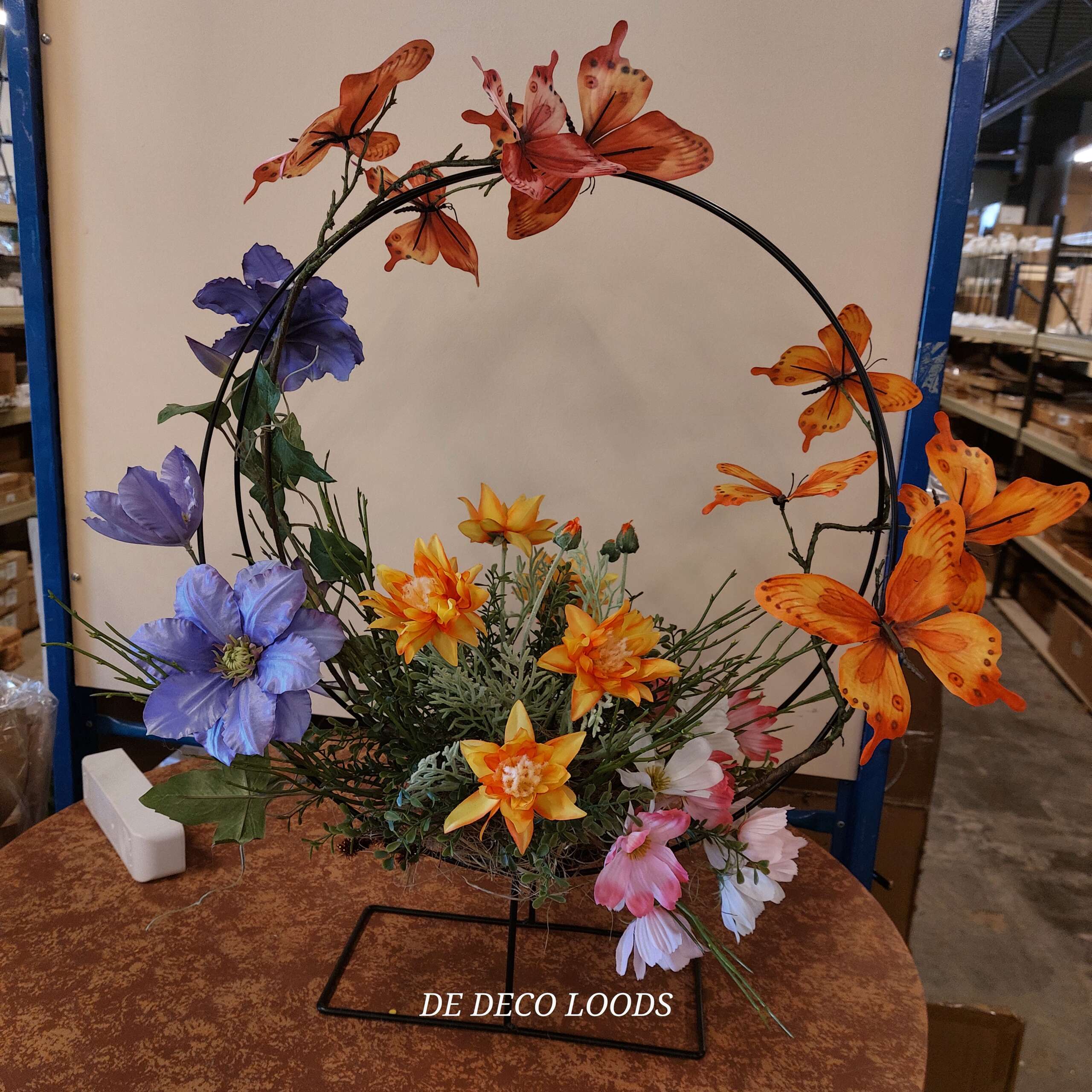 Vlinder ring 50cm, brengt sfeer, elegantie en een vleugje natuur in huis met deze unieke decoratieve bloemenring op standaard. Dit prachtige arrangement combineert een strak, modern metalen frame met een speelse en kleurrijke compositie van kunstbloemen en sierlijke vlinders.