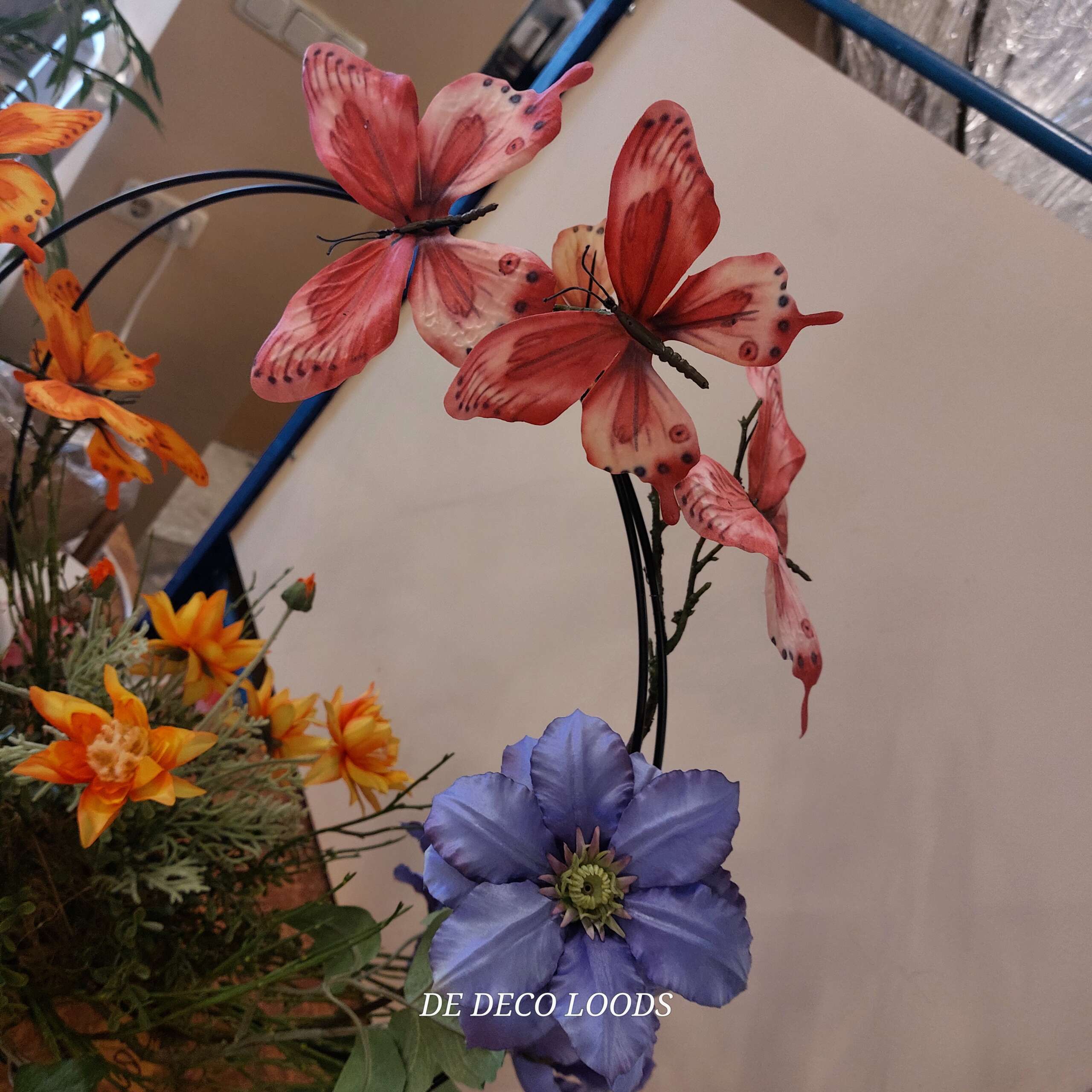 De gebruikte materialen zijn van hoge kwaliteit, waardoor het arrangement duurzaam is en zijn schoonheid langdurig behoudt zonder onderhoud. Geen water geven of verwelkte bloemen – alleen blijvende charme. De combinatie van realistisch ogende bloemen en decoratieve vlinders maakt dit stuk bijzonder geschikt als eyecatcher op een tafel, dressoir of in een etalage.